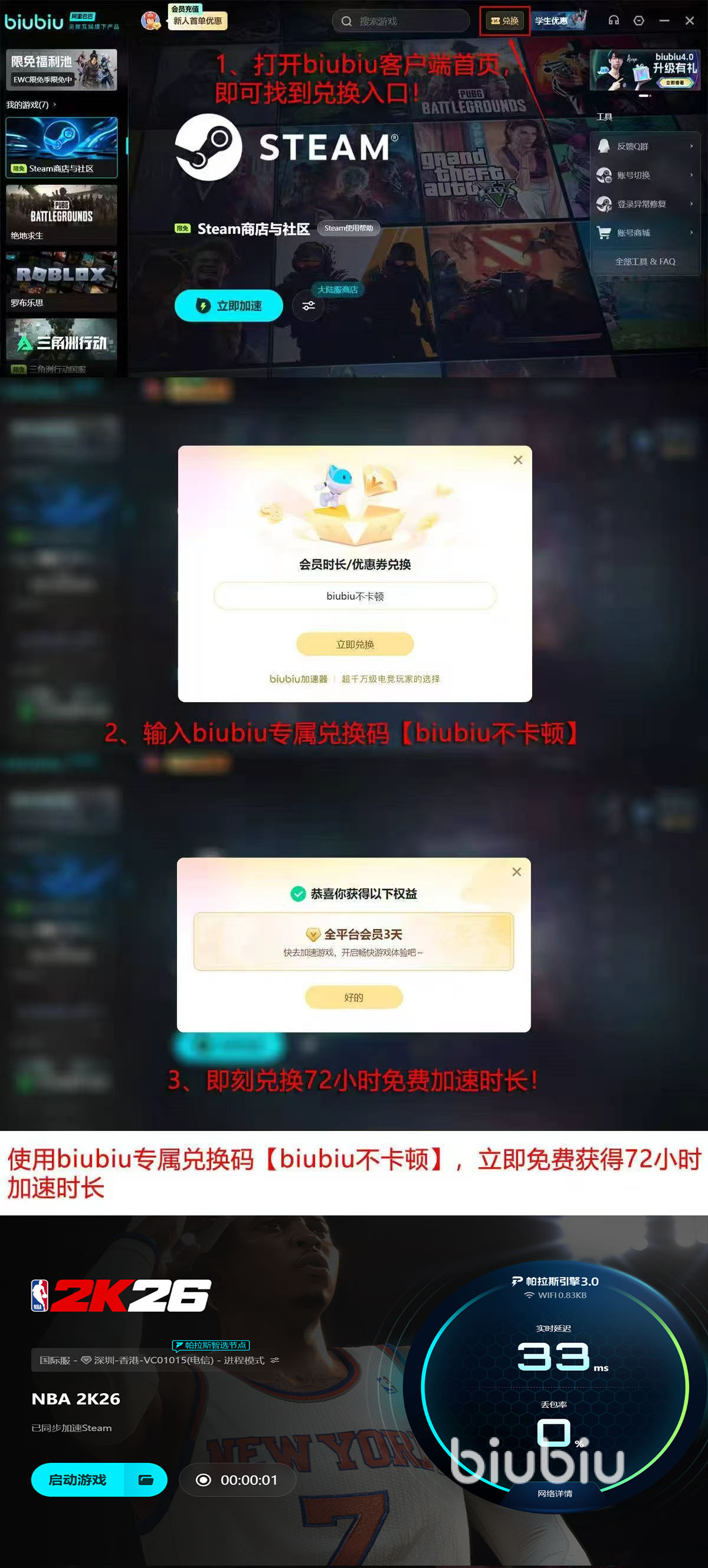 更值得一提的是biubiu加速器在福利設(shè)計(jì)上的用心,它為玩家們提供了極低的嘗試門檻,讓任何人都能輕松體驗(yàn)到網(wǎng)絡(luò)優(yōu)化的魅力。新用戶只需完成下載和登錄,就能立刻享受24小時(shí)的穩(wěn)定加速服務(wù),而在此基礎(chǔ)上,如果輸入專屬口令【biubiu不卡頓】,還能額外疊加72小時(shí)暢玩時(shí)長,總共長達(dá)96小時(shí)的無憂體驗(yàn)。這不僅讓玩家有足夠的時(shí)間深入測試加速效果,還能在多種場景下感受到延遲下降、丟包減少所帶來的絲滑手感。無論是因網(wǎng)絡(luò)不穩(wěn)頻繁掉線,還是因?yàn)殚W退問題而心態(tài)崩盤,biubiu都能幫助你快速找回流暢體驗(yàn),讓游戲真正回歸樂趣。