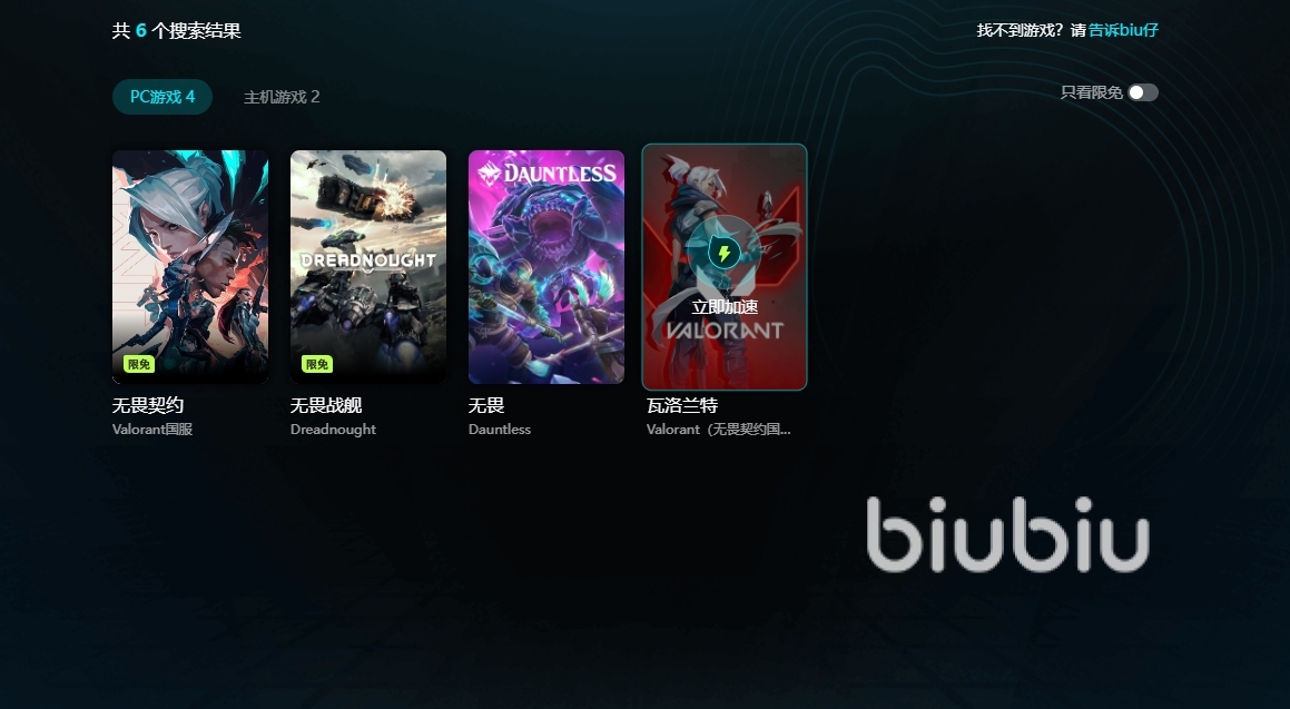 另外,暑假的7月8日到8月24日期間,biubiu限免活動(dòng)正如火如荼進(jìn)行中,每日優(yōu)選精品游戲加入限免名單,限免游戲即點(diǎn)即玩,無畏契約近期正在進(jìn)行限免,想要了解哪些游戲正在限免,登錄客戶端即可查看。