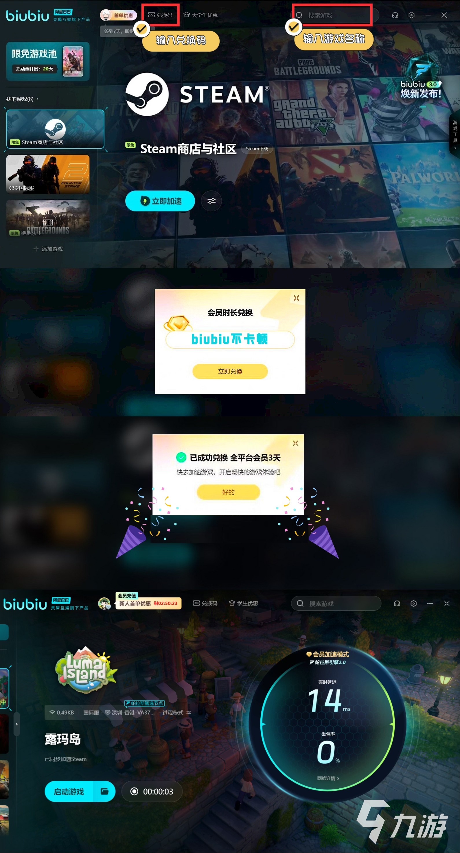 如果你之前沒用過這個(gè)軟件,那么作為新用戶你能享受到一項(xiàng)福利,只需完成注冊,就能領(lǐng)到24小時(shí)的加速時(shí)長,還有一個(gè)福利是適用于所有用戶的話,大家輸入兌換碼【biubiu不卡頓】后,就能獲取3天的加速時(shí)長。