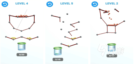 不同的繩子連接處會(huì)積攢著不同數(shù)量的小球,需要玩家自行判斷哪根繩子能切哪根繩子不能切,玩家選中正確的繩子后進(jìn)行切割,能將繩子上的小球掉落進(jìn)底端的桶內(nèi)即為勝利,此款游戲需要玩家極富耐心及判斷力,開局簡單可以無腦過,之后游戲布局變得越來越復(fù)雜,很有挑戰(zhàn)性。