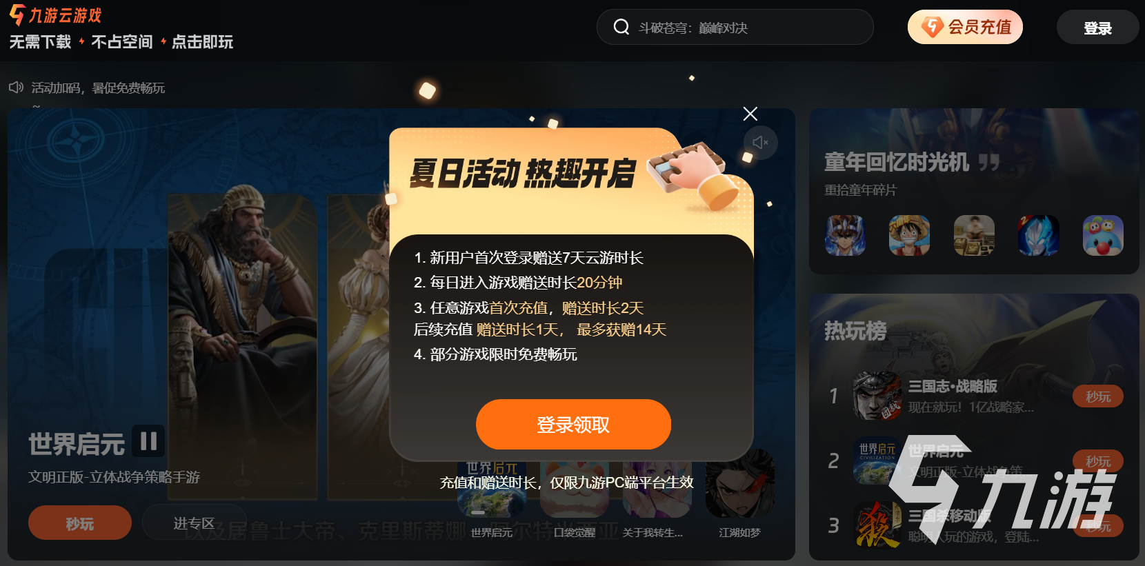 說到九游云平臺(tái)的優(yōu)勢,除了便捷的云端操作體驗(yàn),九游還推出了多項(xiàng)福利,助力玩家更好地探索斗破世界。首次登錄九游云游戲平臺(tái)的玩家可以免費(fèi)獲得7天的游戲時(shí)長,讓你有足夠的時(shí)間體驗(yàn)和沉浸在游戲的精彩世界中。而且,每天登錄九游云平臺(tái)還可獲得20分鐘的額外時(shí)長,保持你在游戲中的連續(xù)體驗(yàn)。不僅如此,首次充值的玩家還能額外獲得2天的免費(fèi)游戲時(shí)長,給你更多時(shí)間提升角色實(shí)力、挑戰(zhàn)更高難度的副本,享受游戲中的每一個(gè)精彩瞬間。