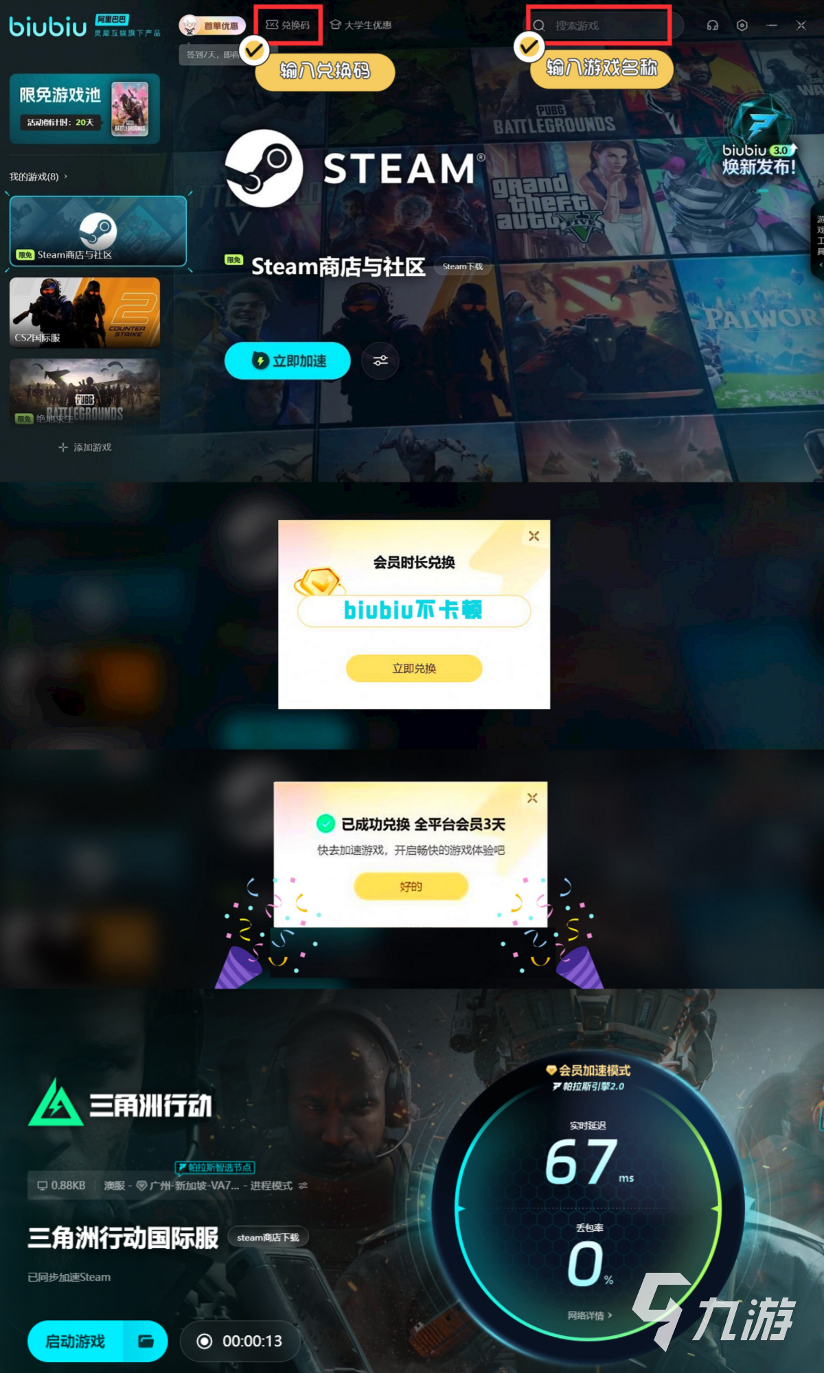 此外,現(xiàn)在所有平臺(tái)用戶,都能輸入口令【biubiu不卡頓】來(lái)兌換72小時(shí)加速時(shí)長(zhǎng),這對(duì)于廣大新用戶而言,疊加后便是96H哦,如此就能去為自己喜歡的格列游戲作品開(kāi)啟加速了,享受穩(wěn)定且絲滑的體驗(yàn)效果。