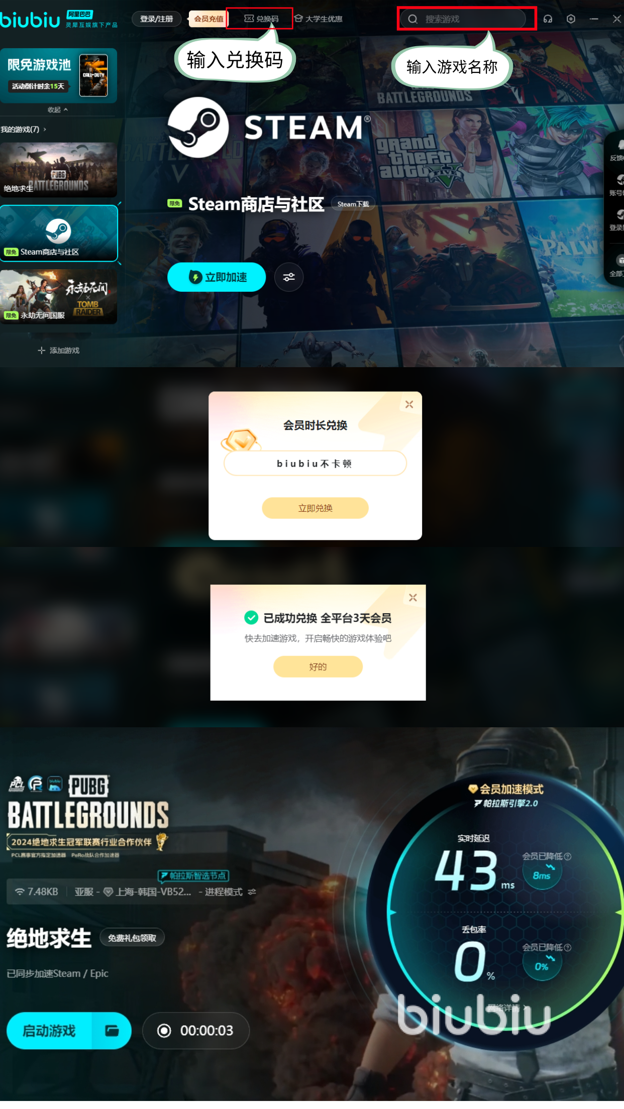 若是小伙伴們擔(dān)心玩的時(shí)候會出現(xiàn)閃退卡頓的情況,影響到大家的操作的話可以用加速器,上面給大家?guī)淼倪@款biubiu簡單好用,很適合新用戶,新人登錄立刻就能得到24h免費(fèi)加速服務(wù)。此外,平臺還給每個(gè)小伙伴提供了三天體驗(yàn)時(shí)間,大家用【biubiu不卡頓】去兌換碼去領(lǐng)取即可。