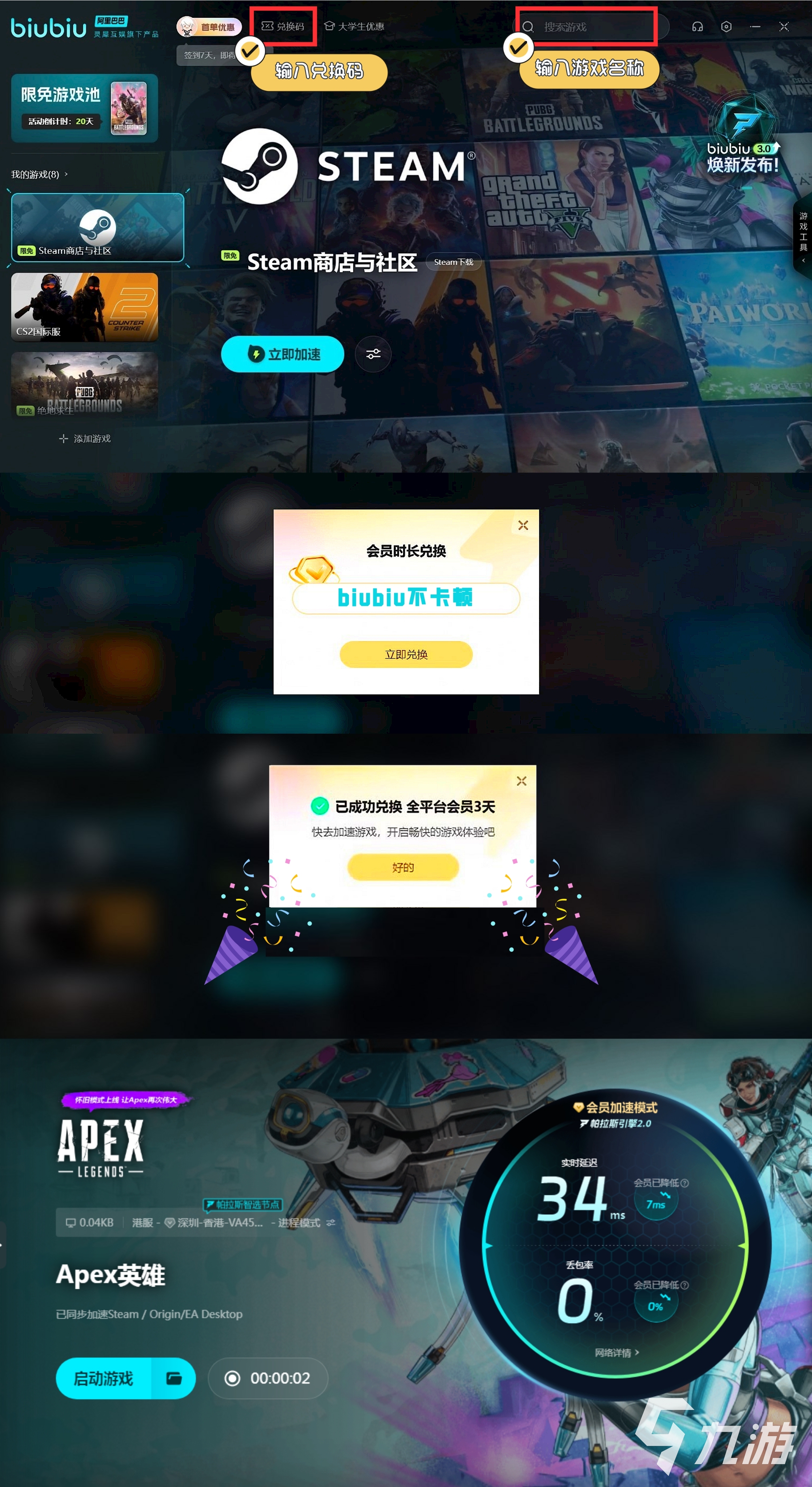 如果希望獲取更多的加速時間,可以輸入口令【biubiu不卡頓】來領取72小時的加速,這個是所有用戶皆可去領取的,如果不清楚如何操作,請參考下圖,值得注意的是,對于新用戶而言,這些福利疊加起來總共可以獲得96小時的免費加速體驗哦。