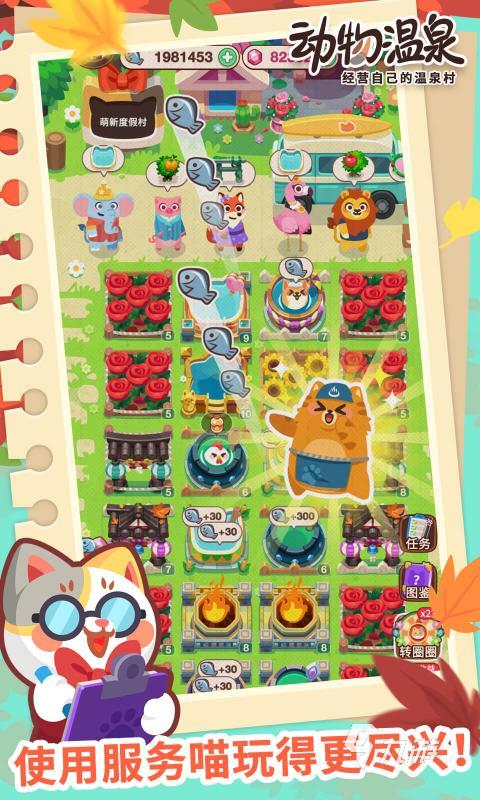 一款休閑經(jīng)營類游戲,玩家經(jīng)營一家溫泉并歡迎周圍的動物來光顧,動物們在享受之后會留下相應的報酬,玩家可以在游戲中不斷地升級自己的溫泉店,并迎接越來越多不同的動物們來泡溫泉,每一種小動物都有著不同的回報。
