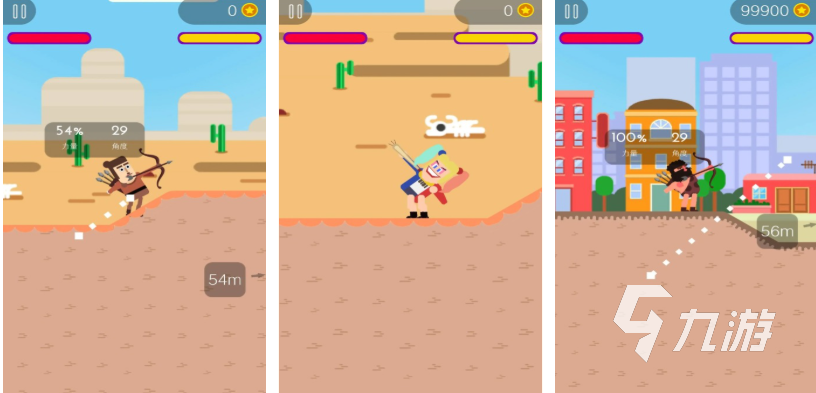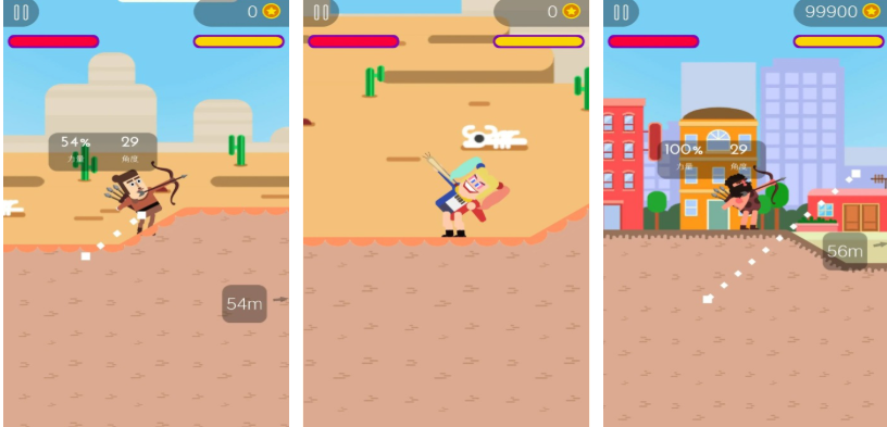 這是款模擬扮演弓箭手的拋物線主題射擊類手游,支持豎屏操作也展現(xiàn)出很滑稽的美術(shù)UI,玩家扮演的滑稽2D弓箭手需要靈活操作射擊目標(biāo),靈活利用拋物線的原理就能讓弓箭手快速參與戰(zhàn)斗,場景設(shè)定多樣包含著沙漠和城市等背景,獨創(chuàng)的拋物線射擊戰(zhàn)斗元素像極了“彈彈堂”,弓箭武器類型繁多給人提供的射擊快感也很強(qiáng)。