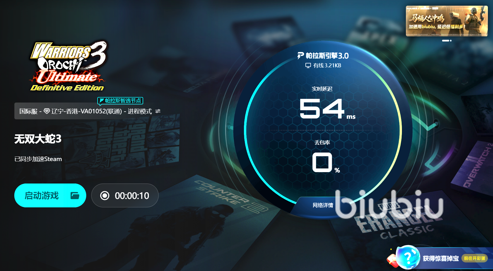 操作過程非常直觀。打開biubiu客戶端,在搜索欄輸入無雙大蛇3終極版點擊。系統(tǒng)會自動完成節(jié)點檢測與路徑優(yōu)化,無需手動調(diào)整參數(shù)。后臺運行輕量,不占用CPU資源也不會影響幀率。加速完成后重新進入游戲,讀取速度更快,場景渲染更順暢,戰(zhàn)斗中幀率保持穩(wěn)定不再突然驟降。