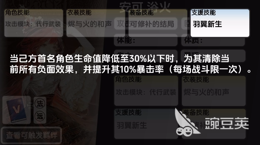 安可的裝備技能叫做可修補的結(jié)局,當(dāng)己方所在編隊當(dāng)中有角色的體能耗盡,并且導(dǎo)致提前離場后,此時已存在的相關(guān)聯(lián)的羈絆技能還是依然生效的,而此時離場角色視為加入支援編隊,這個裝備效果是比較適配于安可的能力,帶來的持續(xù)支援效果很明顯,當(dāng)然后期大家也可以根據(jù)安可需要的戰(zhàn)場能力來進(jìn)行調(diào)換,這里的裝備技能一般都是挑選的。