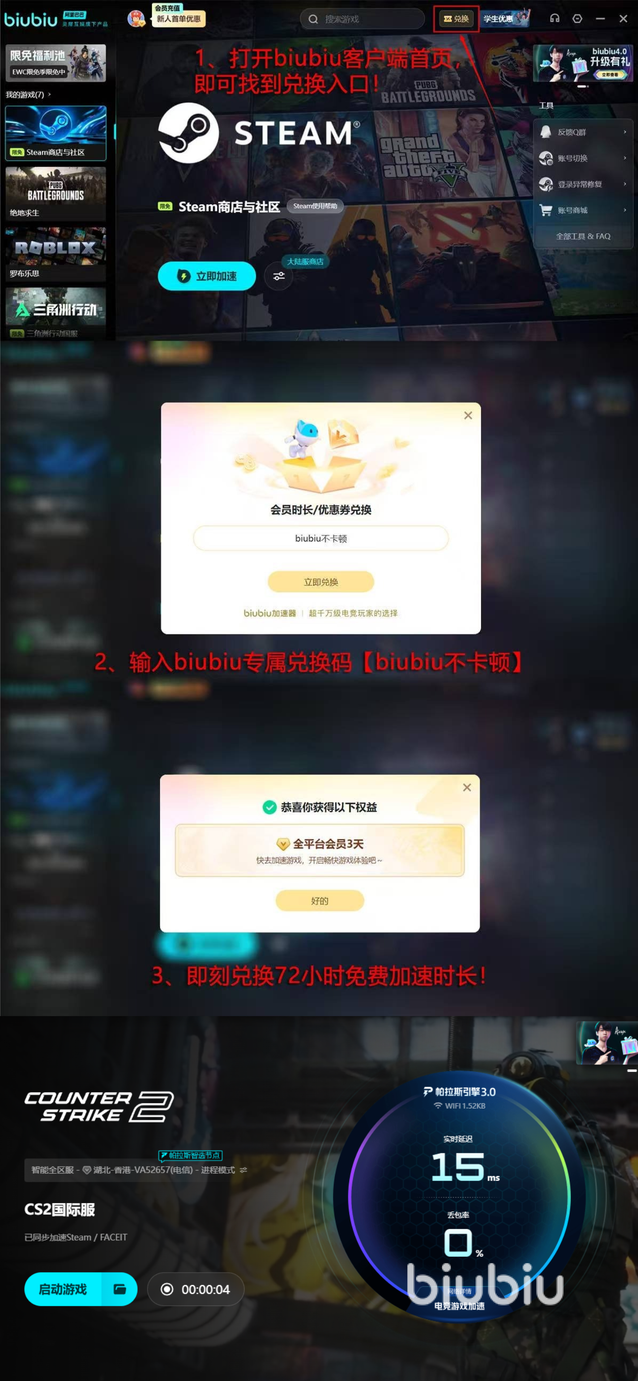 由于這款游戲是競技類型的,所以大家玩的時(shí)候可以用加速器,這樣無論是攻方還是首方都可以保證網(wǎng)絡(luò)的通暢,最大化的發(fā)揮個(gè)人技術(shù)?,F(xiàn)在新人下載上方分享的biubiu可以得到24小時(shí)免費(fèi)提速時(shí)間,官方直接贈(zèng)送,此外還提供了三天額外的提速福利,但是需要大家自己通過在對(duì)應(yīng)區(qū)域輸入【biubiu不卡頓】進(jìn)行兌換才行。