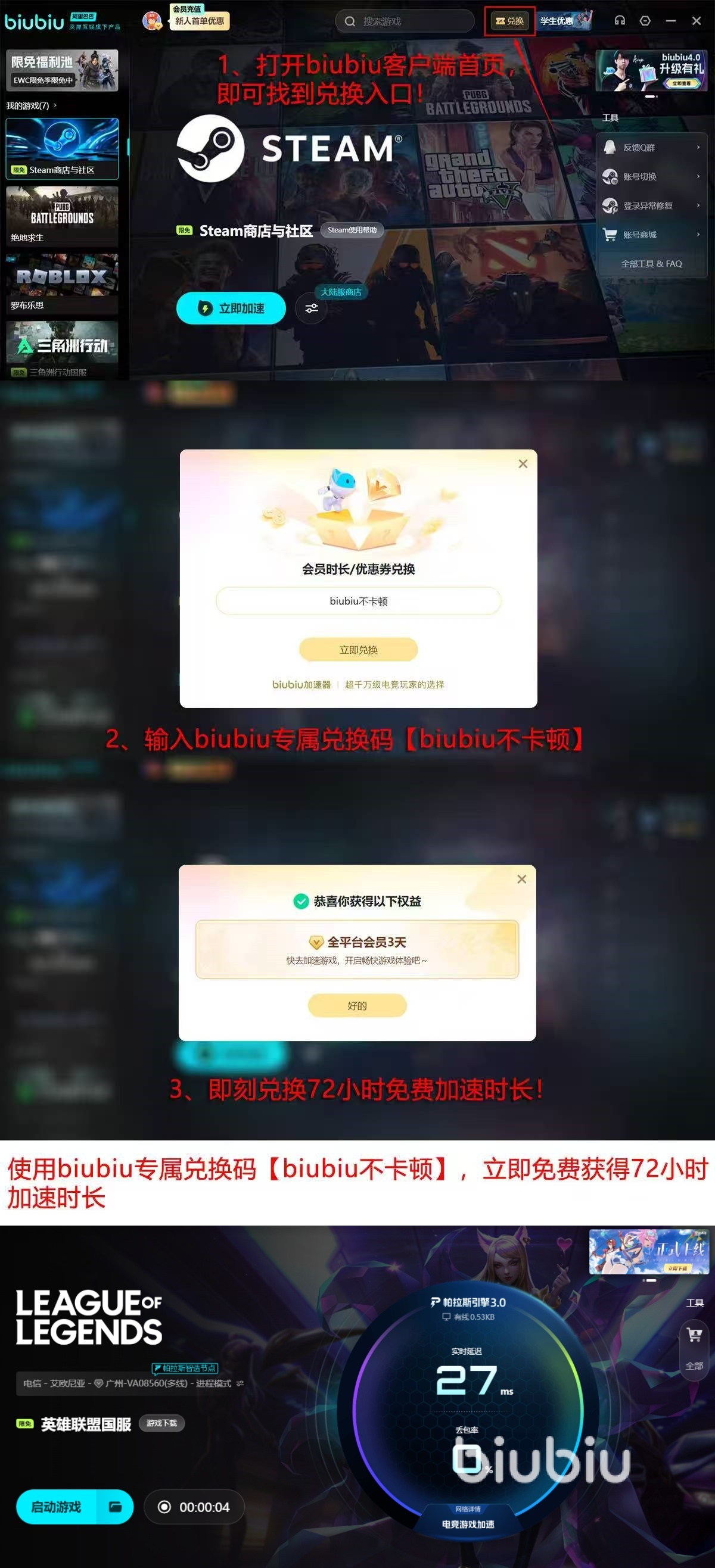 當(dāng)然了,如果玩家長時間體驗游戲,希望能解鎖更多的加速福利,那么到時還可去輸入【biubiu不卡頓】,如此所有平臺小伙伴均可領(lǐng)取到72H的加速。