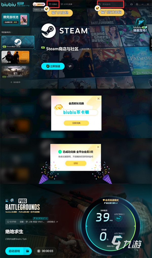 若是各位想要獲取更多加速機(jī)會(huì)也是可以的,只需去點(diǎn)擊兌換,然后輸入【biubiu不卡頓】,這樣就能成功領(lǐng)取72h的加速時(shí)長(zhǎng)了,對(duì)于新用戶(hù)而言,在福利疊加后,更是能拿到96h的加速機(jī)會(huì),這個(gè)還是非常不錯(cuò)的哦。