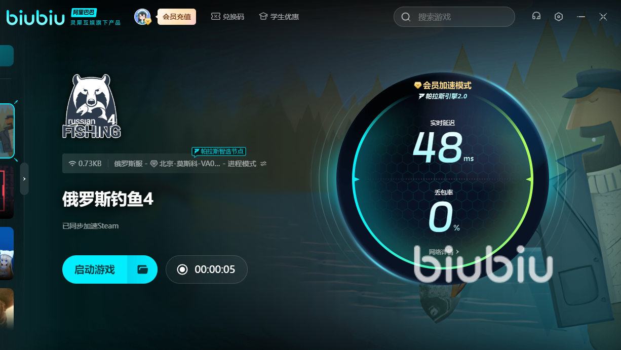 俄羅斯釣魚4是一款優(yōu)秀的國際大作,如今暫時沒有上線國服。大家想要與其他國際的人一同釣魚的話,又要用上biubiu。才能突破限制,繼續(xù)來到大洋彼岸中釣魚。新用戶的話可領(lǐng)取三個小時的免費加速,另外新老用戶輸入【biubiu不卡頓】,便可額外獲得三天免費加速。要是釣魚的過程中太卡的話,自己也會變得沒有耐心,更別談將魚釣上來了。只要用上加速器,又能讓你流暢做好每一個動作,避免魚餌被吃了。