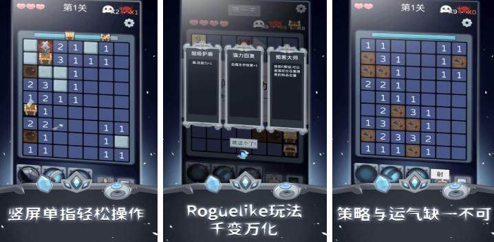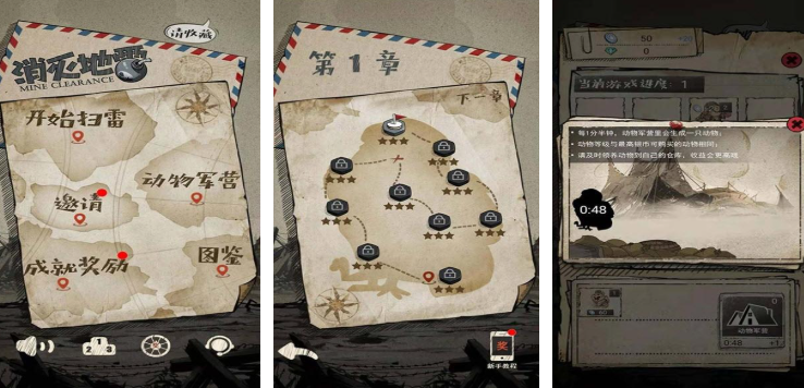 掃雷大冒險以冒險探索為核心,要將掃雷的玩法與各種場景進行結(jié)合,在游戲內(nèi)各種不同的場景外觀,與地雷的表現(xiàn)也會隨著主題變化而變化,森林場景中格子為樹葉紋理、地雷以陷阱圖標(biāo)呈現(xiàn),古堡場景中格子為石磚紋理、地雷以炸彈圖標(biāo)呈現(xiàn),增強視覺區(qū)分度與代入感,玩家可自由切換已解鎖場景,不同場景的難度曲線與特殊機制存在差異。