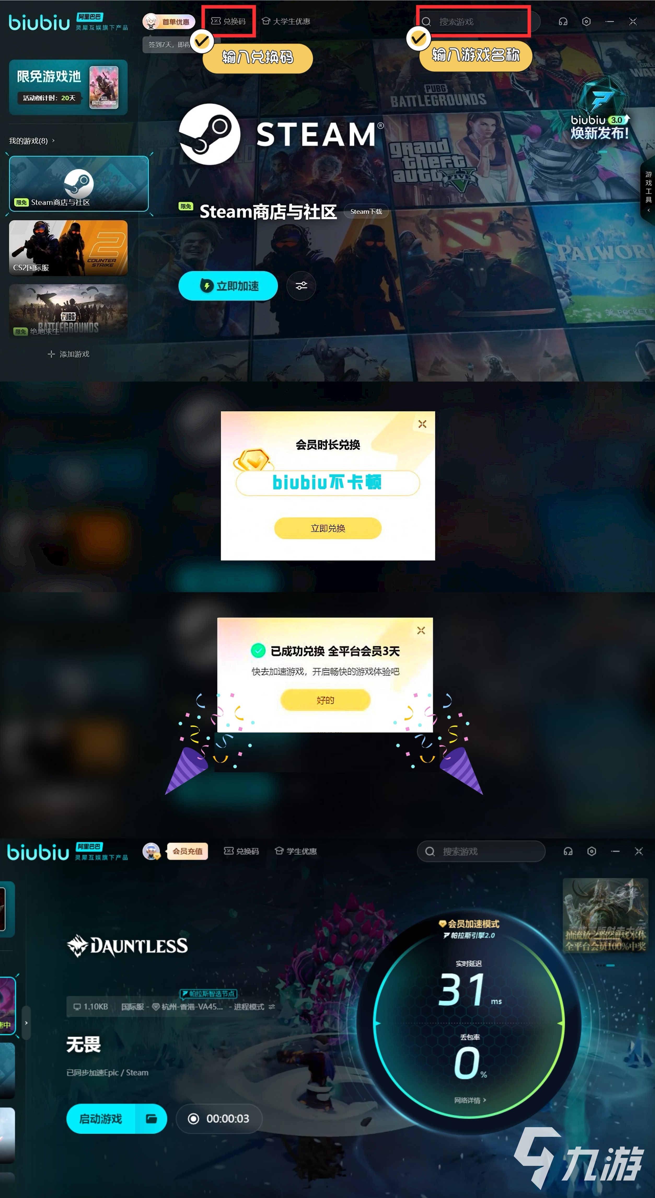 OS的最差要求是Windows 7 DX11 Support,最高為Windows 10,按照最丐版來進(jìn)行運行效果的設(shè)定的話,最好只開到720p,否則容易出現(xiàn)崩潰的情況。而高配則能開到1080p的最高設(shè)定效果。在了解完以上的效果之后,各位小伙伴們就能對照自查一下自己的電腦硬件以及網(wǎng)絡(luò)了。值得一提的是大家選擇biubiu后,它為新用戶提供了24小時免費加速時間,還提供領(lǐng)取三天免費加速時長的【biubiu不卡頓】兌換碼活動供新老用戶們使用。