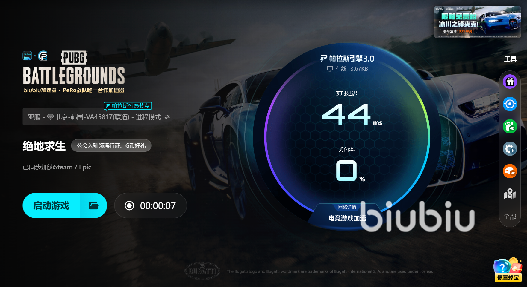 biubiu加速器的使用流程非常省事。只需進入客戶端,搜索絕地求生并點擊啟動,加速就會自動完成,輕松一步搞定。后臺占用非常低,不會拖慢電腦或手機,同時還能兼容多種游戲平臺。不僅能解決PUBG掉幀的問題,支持多種類型游戲加速,讓你不必再裝多個軟件,一次安裝全搞定。