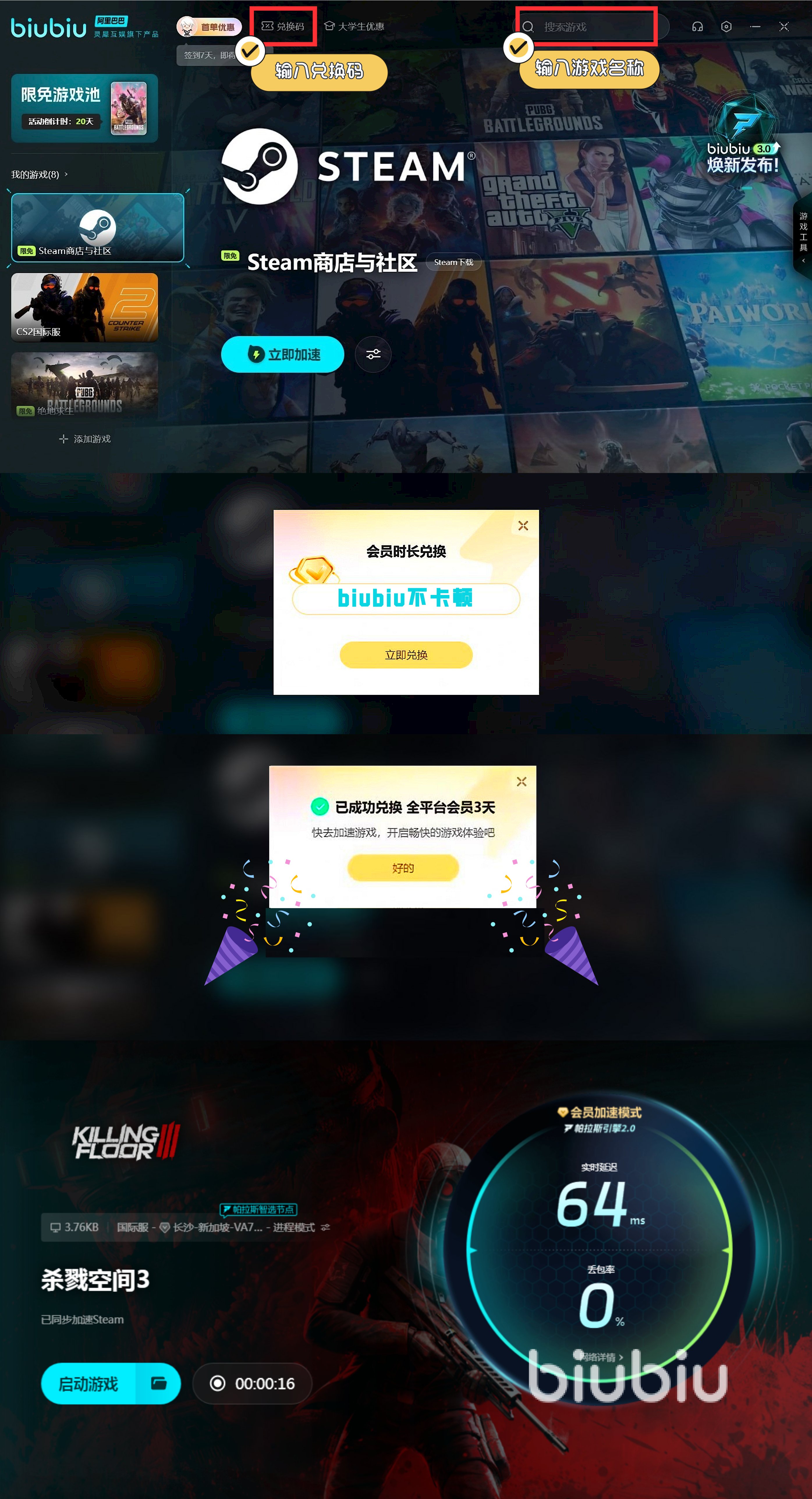 不信看看,會員模式下是只有64ms的延遲的,之前上線測試活動的時候,biubiu就已經(jīng)上線這個服務的,效果可以同步到steam哦,而且很多參與測試的玩家用了之后,也感覺到了網(wǎng)絡質量有飛躍般的提升,很快就能流暢玩的。