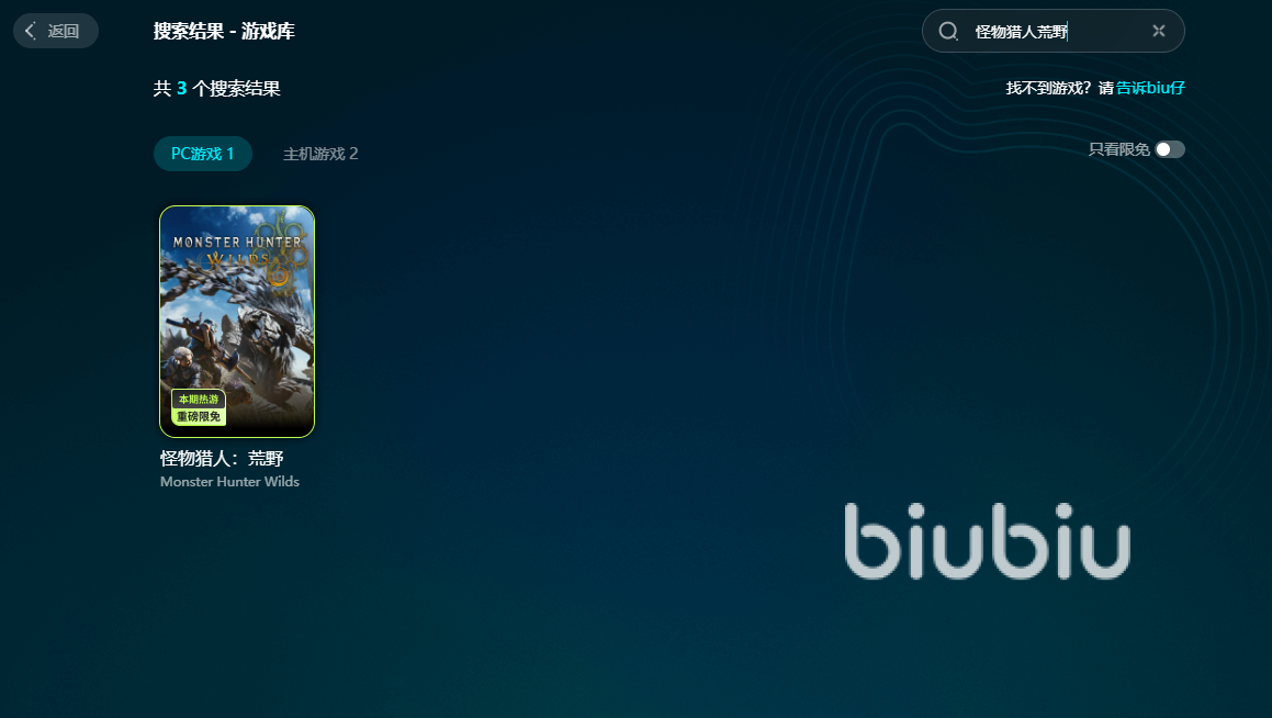同時biubiu端內(nèi)將上線怪物獵人活動,活動時間為2月28日13點-3月14日23點59分,抽獎獎品內(nèi)容包括游戲本體、游戲周邊、年卡、3天會員、3小時會員、1小時會員等,怪獵荒野限免加速時間為即日起-3月14日23點59分。