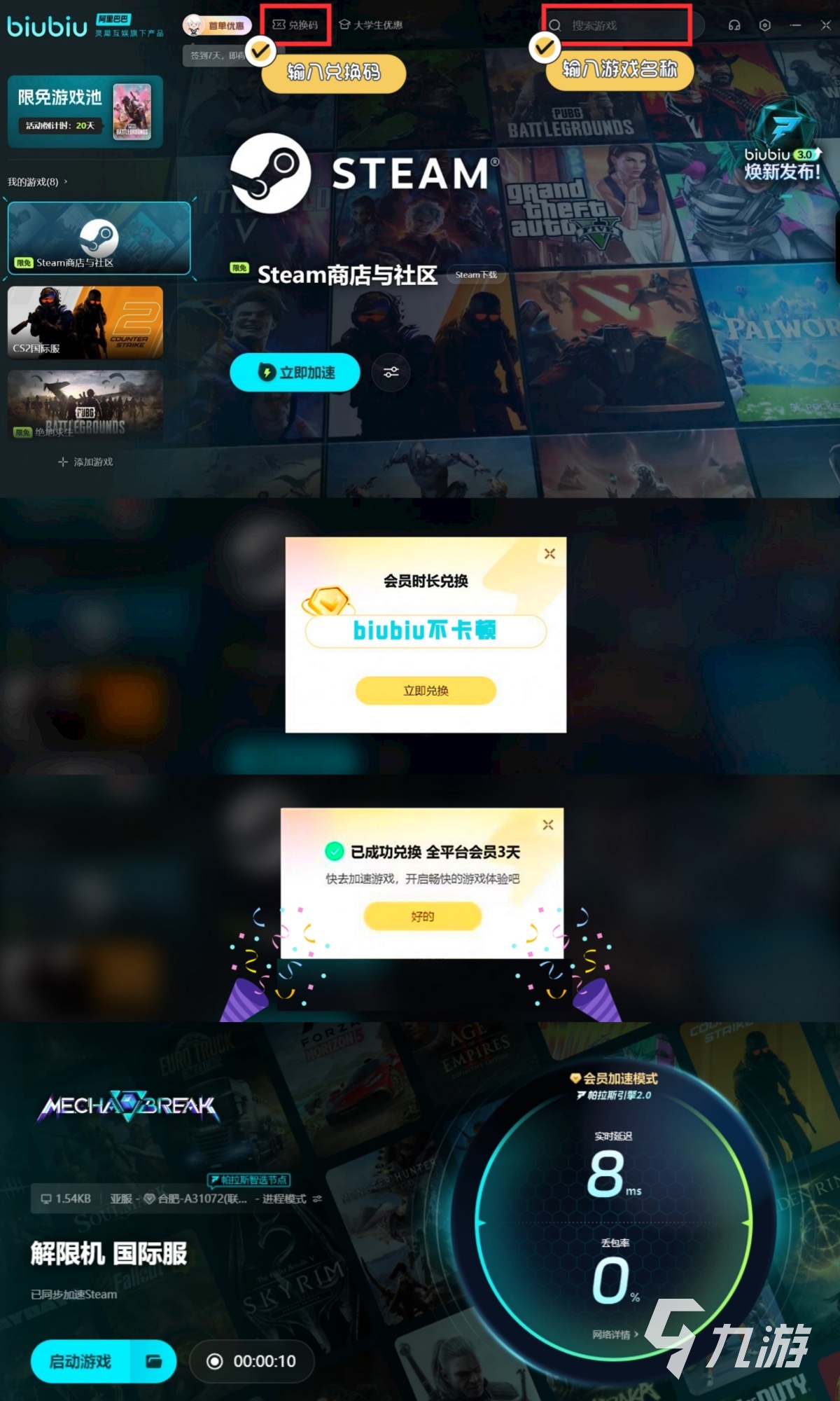 大家玩的時(shí)候可以試試上方的提速應(yīng)用,效果很不錯(cuò),而且新用戶注冊(cè)就會(huì)立刻得到3h體驗(yàn)的福利,后面還可以繼續(xù)用biubiu不卡頓去獲取3日體驗(yàn)福利,這是每個(gè)小伙伴都可以到手一次的。