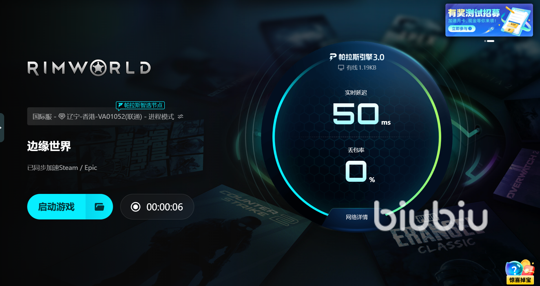 為了幫助玩家更好地體驗,biubiu加速器推出了福利體驗活動。新人注冊后可領(lǐng)取24小時免費加速時長,而所有家人只需在客戶端首頁【兌換】進入后寫上口令【biubiu不卡頓】,還可以額外再獲得72小時免費加速。這些待遇不僅適用于《環(huán)世界》,也覆蓋多類熱門網(wǎng)絡(luò)游戲,讓你在任何玩法中都能保持穩(wěn)定不卡頓地連接。