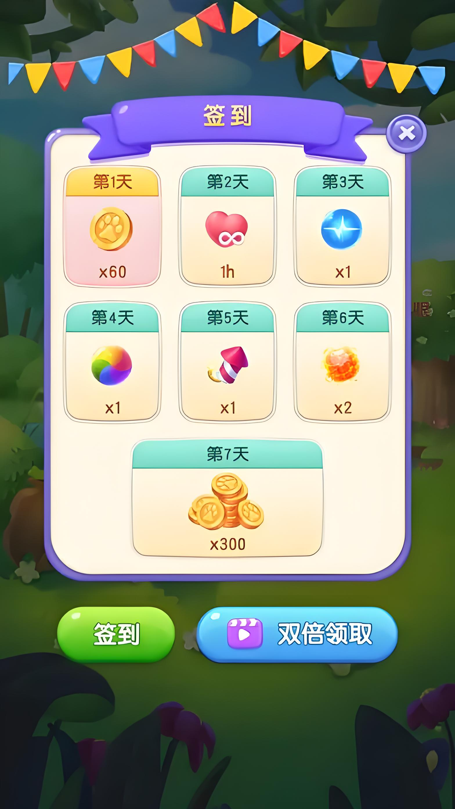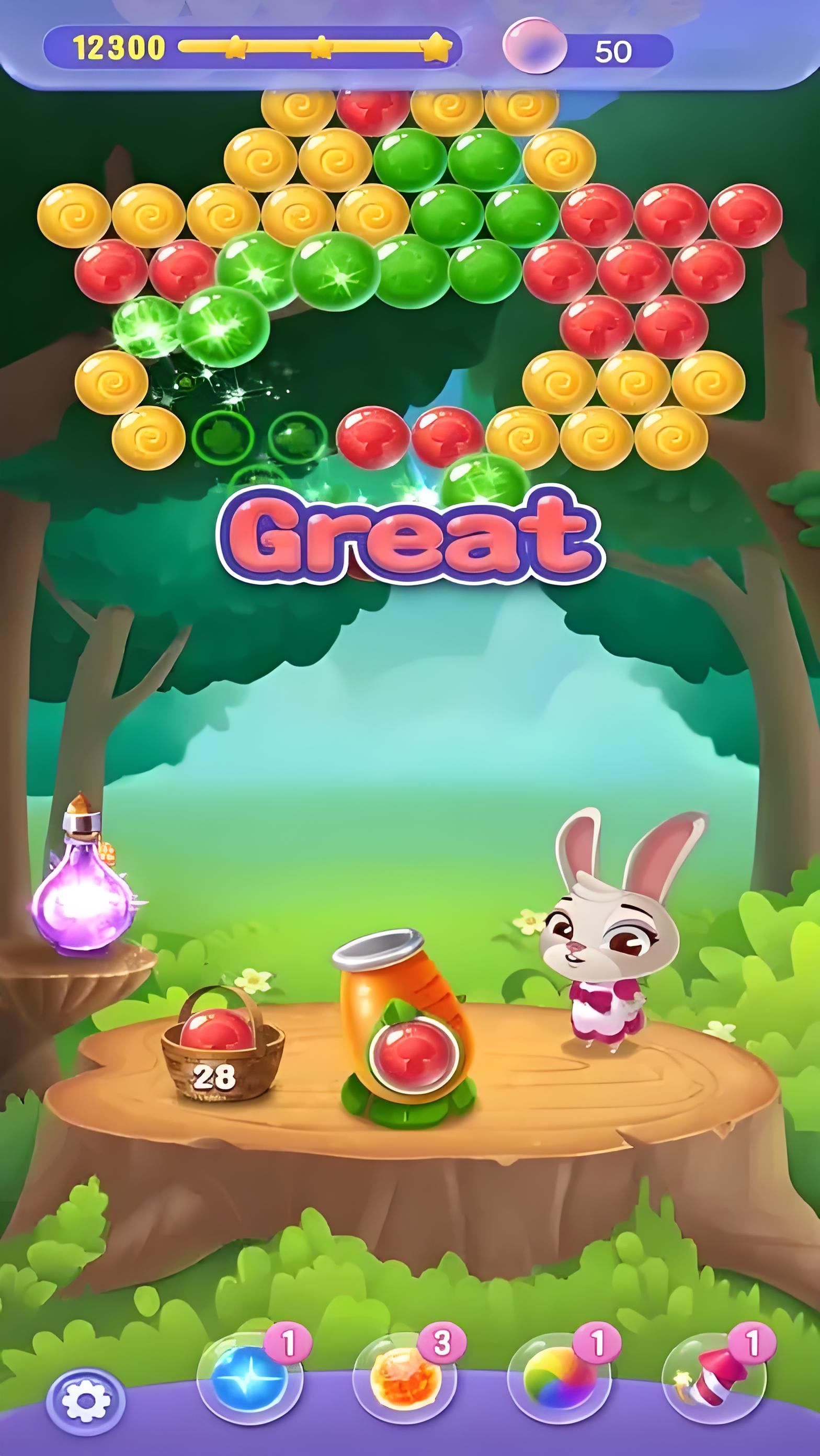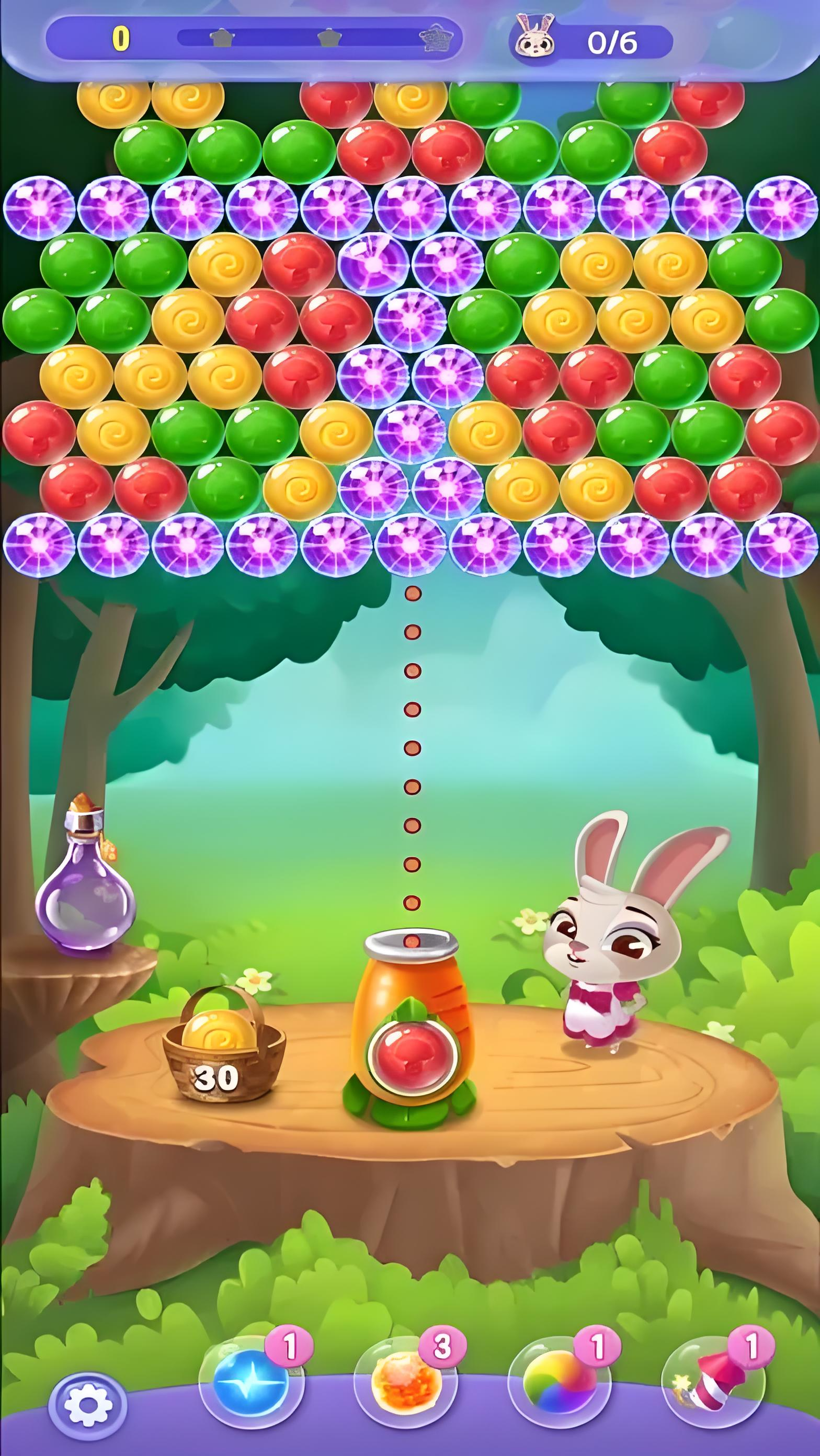 游戲的基本目標(biāo)是發(fā)射彩色泡泡使其與相同顏色的泡泡相連,形成三個(gè)或以上的同色組合即可消除。玩家通過觸摸屏幕控制炮臺(tái)方向,點(diǎn)擊發(fā)射泡泡。關(guān)卡中通常需要解救特定物品(如小兔子)或達(dá)成消除數(shù)量目標(biāo)才能通關(guān)。若泡泡堆積超過警戒線,則游戲失敗。物理碰撞機(jī)制是游戲的亮點(diǎn)之一,發(fā)射的泡泡可能觸碰墻壁反彈,或與其他泡泡碰撞后黏附。這種設(shè)計(jì)既增加了操作空間,也要求玩家更謹(jǐn)慎地規(guī)劃發(fā)射角度。