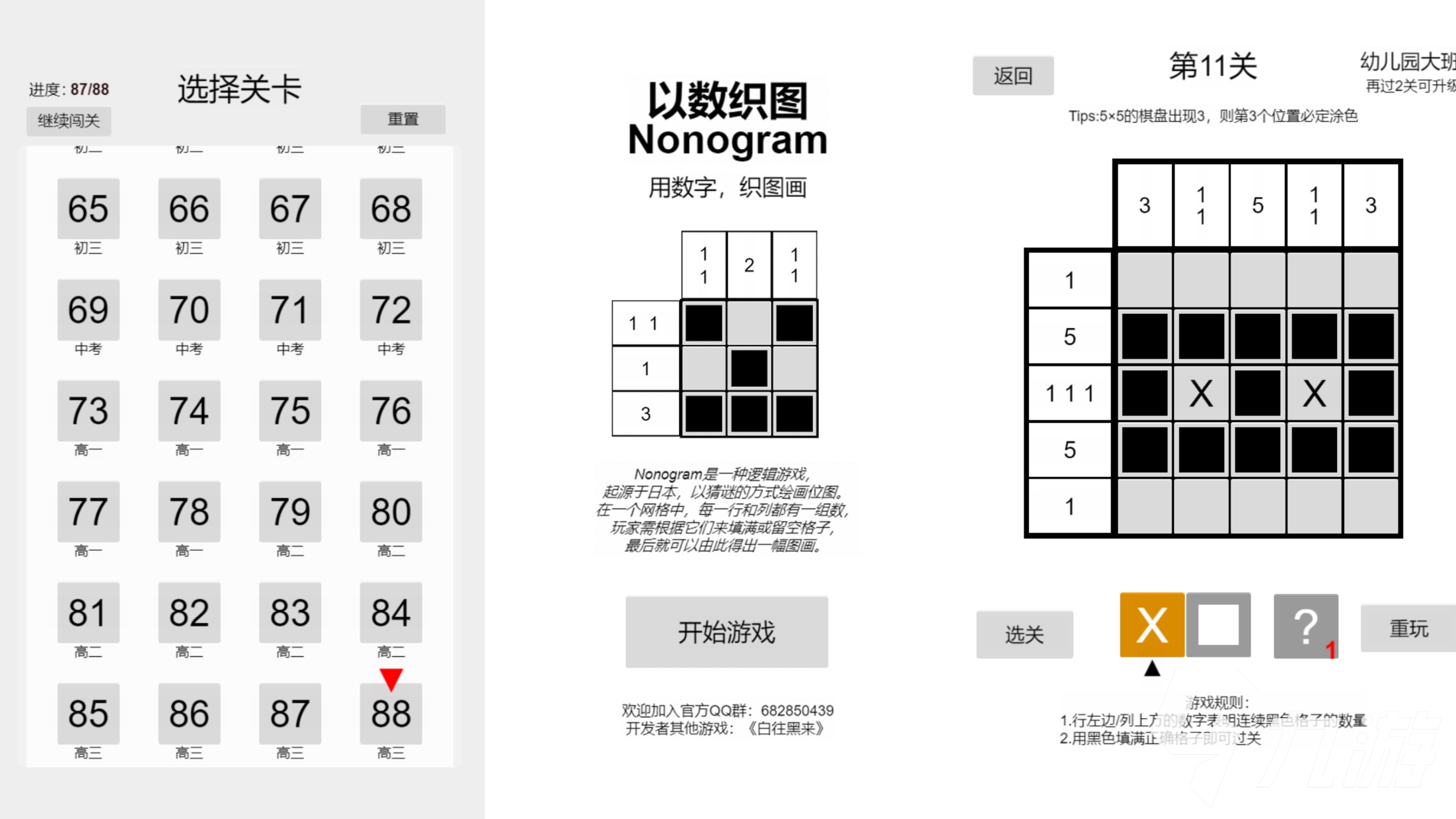 《以數(shù)織圖Nonogram》是一款邏輯數(shù)字填空游戲,很適合對數(shù)字敏感以及邏輯思維很強(qiáng)的同學(xué)們。游戲的規(guī)則也很簡單,就是玩家需要根據(jù)給出的數(shù)字,找到每一行每一列的數(shù)字規(guī)律,并將它們填補(bǔ)完整直到最后成為一副畫就算通關(guān)啦!游戲起源于日本,畫面雖然看起來簡單,但是卻不容易破解,在教室里玩的話大家還可以和同桌一起討論。而且游戲的關(guān)卡非常多,越到后面越難,大家快來挑戰(zhàn)吧!