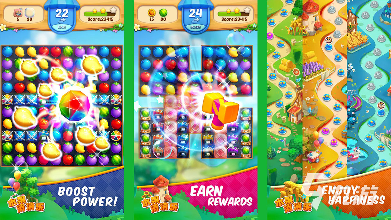 《天天水果消消樂》的主戰(zhàn)場在一個(gè)巨大的水果培育基地中,每一道關(guān)卡都是一座充滿刁鉆難題的果園,玩家需要整理果園中雜亂的水果,用三連消除的方式進(jìn)行篩選,讓每一種水果分好類。消除水果可以積攢能量,能量聚滿之后就可以釋放輔助技能,輔助技能都是隨機(jī)的,有的時(shí)候幫助很大,有的時(shí)候反而起反作用,如果不是實(shí)在無法消除,建議不要過于依賴輔助技能,相信自己的眼睛準(zhǔn)沒錯(cuò)。