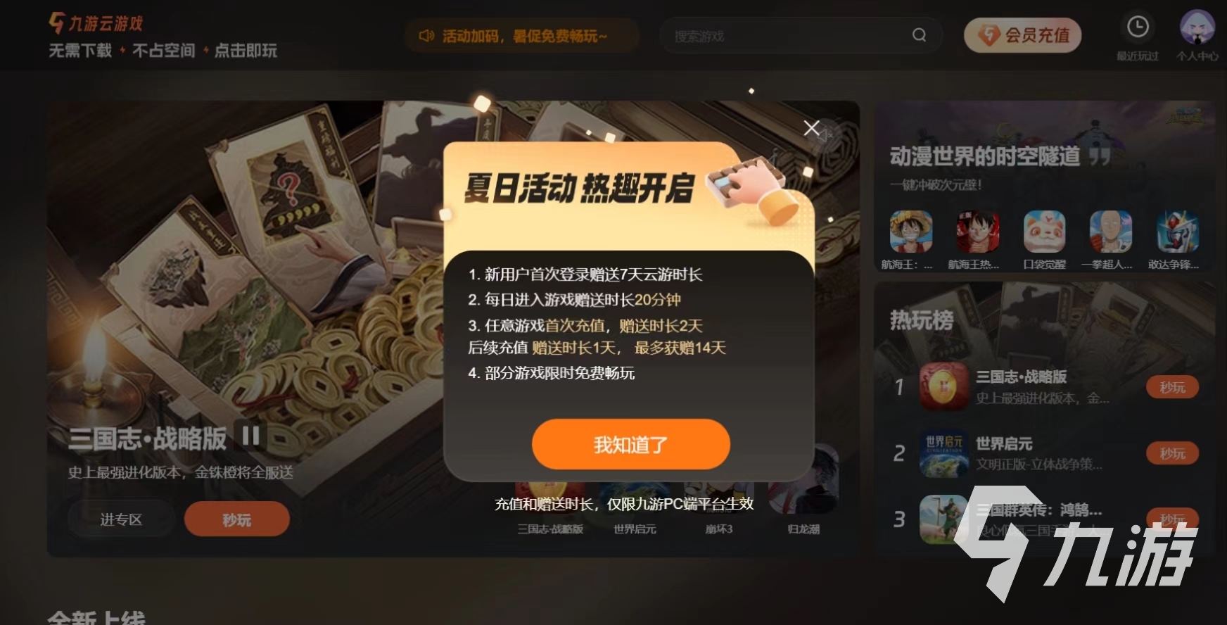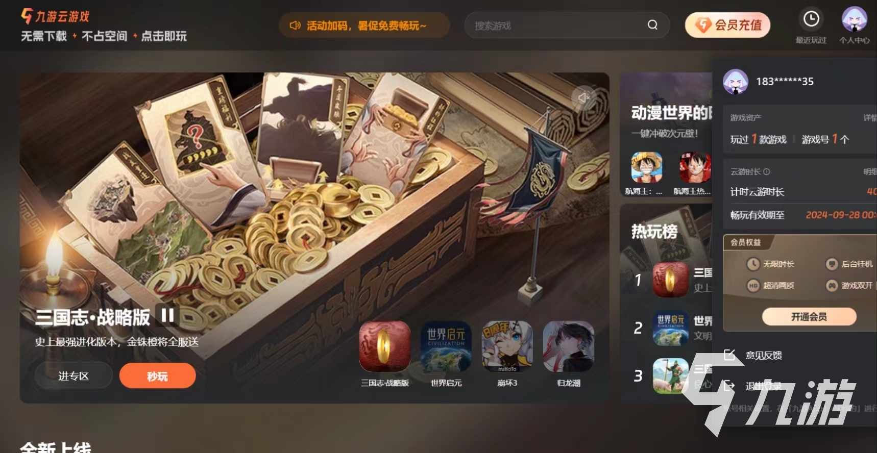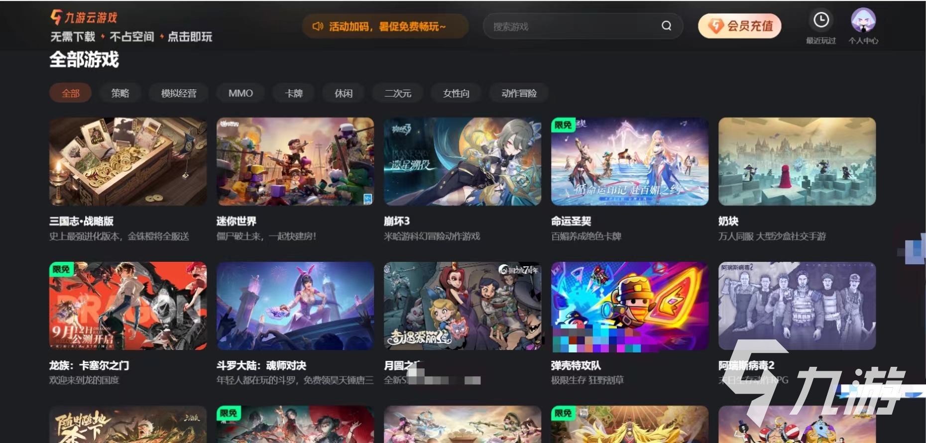 而且九游云游戲不會受設(shè)備平臺的限制,玩家可以在不同設(shè)備上進行通過同一個云游戲賬號隨時隨地繼續(xù)自己的游戲進度,這樣就可以實現(xiàn)多平臺的切換。而且九游云游戲平臺還提供了多種類型的游戲,可以滿足不同玩家的喜好。而且會推出限時免費暢玩活動,這樣大家在活動期間就可以免費體驗游戲,同時還可以通過參與活動獲得其他額外的游戲時長。而且首次登錄會送七天免費試用時長,這樣就可以讓大家充分的去了解九游云游戲這個功能的好處。而且每天進入游戲的時候都會贈送時長二十分鐘,如果大家在游戲上面進入充值的話,還會贈送兩天的時長可以讓大家去進行體驗。