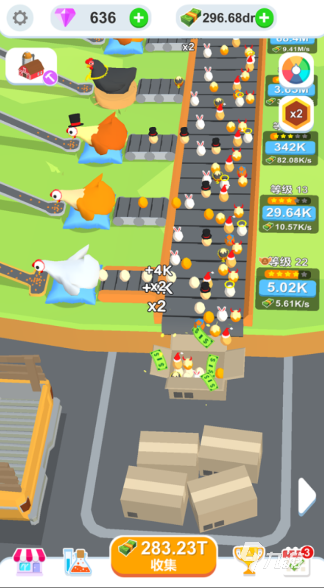 當錢攢到一定程度后,玩家們可以對設備進行升級,同時雞的下蛋速度也越來越快,對應的,雞蛋價格也會持續(xù)上漲,這樣一來形成了一個良性循環(huán),一個井井有條的雞蛋加工工廠就生成了。