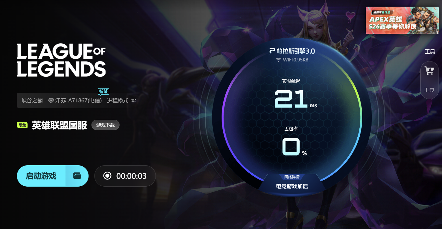 lol一直卡在league界面進不去怎么辦?全球最受歡迎的MOBA電競游戲,長期位居熱門榜單前列,而網(wǎng)絡(luò)的波動問題卻時刻困擾著大家,高強度團戰(zhàn)時,常遇到畫面卡頓、幀率驟降甚至操作延遲的問題,嚴(yán)重影響競技發(fā)揮。網(wǎng)絡(luò)延遲高、丟包嚴(yán)重或連接不穩(wěn)定,尤其是在技能密集釋放的團戰(zhàn)階段,數(shù)據(jù)傳輸壓力劇增,普通網(wǎng)絡(luò)環(huán)境難以承載。為解決這一難題,小編特將文中的這款加速工具分享給大家。