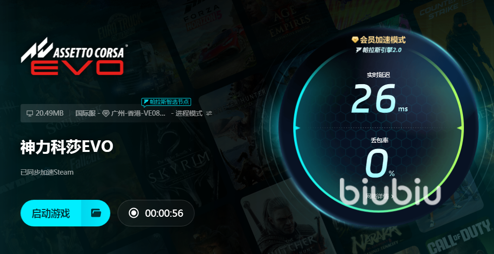 還在挑選加速器的小伙伴可以試一試biubiu,新用戶免費加速3H,首充價格最低只要15元起。體驗完新用戶試用時長以后所有的用戶還能憑借【biubiu不卡頓】來兌換3天免費加速。這些免費時長可以加速全站資源,找到神力科莎EVO以后直接點擊藍(lán)色按鈕就啟動加速了。