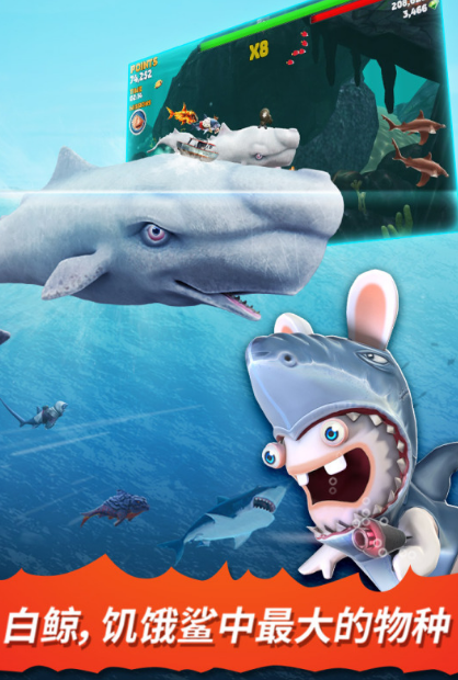 這款設(shè)定在深海水域中的進(jìn)化游戲,玩家作為大鯊魚進(jìn)行海洋探索,體現(xiàn)自然界優(yōu)勝劣汰的法則。游戲整體畫面設(shè)計(jì)的極有動態(tài)感,幾十種深海鯊魚都有各自的特色技能,卡通的形象十分吸引青少年。玩家可以把小魚和海龜作為食物進(jìn)行吞噬,隨著體型增長,也會解鎖更多的品種和道具,但也要注意人類的捕獵和更大的生物。