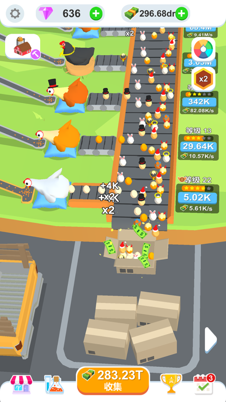 最初在玩家進入游戲時沒有任何資源,此時通過對工廠探索,解鎖一些資源,這些資源可以用于后期階段的車間生產(chǎn),僅僅是有這些資源是不夠的,玩家在游戲中還需要升級生產(chǎn)線,解鎖更多新設(shè)備以生產(chǎn)更多雞蛋。而隨著等級升高,小雞下蛋的速度也會變快,下出來的雞蛋也會更加稀有,可賣出更好的價格。