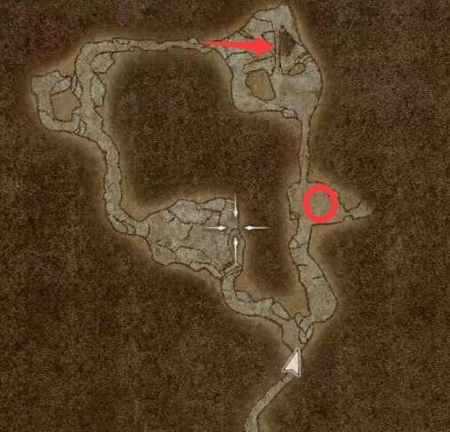 在岔路口位置去選擇右側(cè)路徑會較為的容易,在圖中標記的位置打開寶箱以獲取雙手劍,然后沿著箭頭指示的方向下行至底層洞穴,開啟寶箱就能成功獲得大杖。