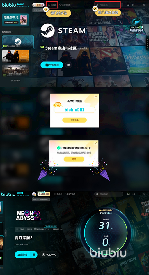 如果你剛剛接觸這款工具,不妨先試試它的免費加速服務(wù)。注冊之后,你可以免費體驗24小時的加速效果,輸入專屬兌換碼“biubiu001”還能再得72小時的會員加速時長,這些加速時長足夠你把游戲的各種問題徹底解決,新用戶總共有96小時時間可以進行免費加速。