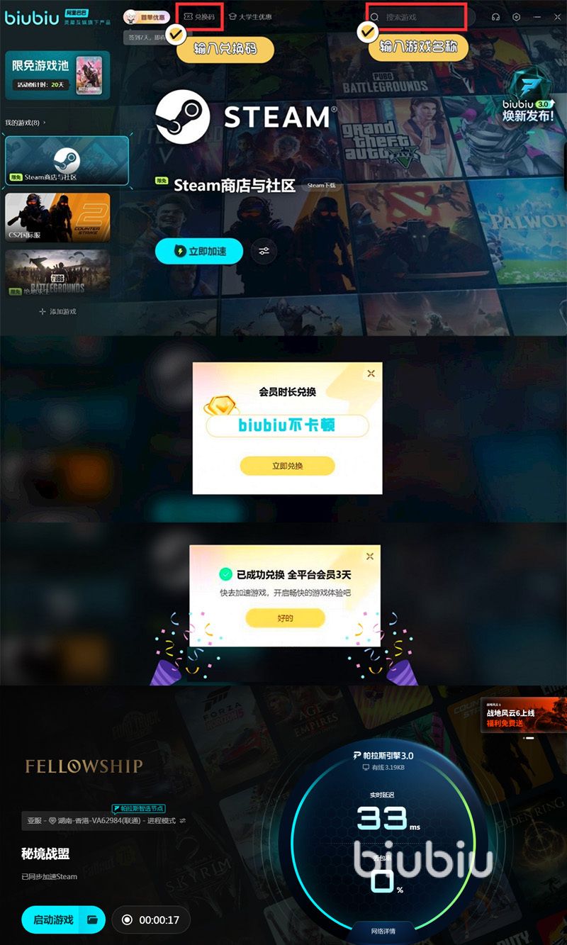 確保游戲過程順暢,玩家安裝好輔助工具biubiu。biubiu通過官方渠道下載,打開游戲庫,直接搜索相關游戲,實現(xiàn)便捷加速。它一鍵加速使用體驗好,直接呈現(xiàn)加速效果。它現(xiàn)在已經(jīng)升級,通過冠軍Aixleft合力打造,采納帕拉斯引擎3.0。biubiu開啟免費試用,新人免費用24小時,再通過兌換碼【biubiu不卡頓】,享受72小時免費提速。