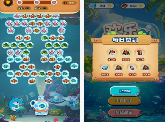 進入以海洋為主題展開消除的手游,里面有海洋動物當(dāng)中各種漂亮的生物,它們在顏色上非常的豐富。而且還有不同的生物類型,比如海星貝殼這樣的元素,也能在這里面通過滿足三個,或一樣的以后進行消除,獲得相應(yīng)的分數(shù),順利通過關(guān)卡。同時每一個玩家在完成任務(wù)的過程中,也能獲得相應(yīng)的獎勵,不斷的解鎖豐富的圖鑒。