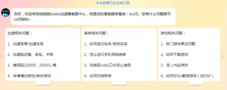 biubiu的使用方式很簡單,每款游戲都是通過藍色按鍵來加速的,點擊即可啟動,游戲結(jié)束以后再回到頁面來結(jié)束加速。初次使用biubiu的小伙伴如果有什么不明白的地方可以向智能客服尋求幫助,點擊智能客服就會看到一些常規(guī)問題的解決方法。如果這些無法解決你的問題,還可以將問題登記反饋給后臺技術(shù)人員進行排查解決。