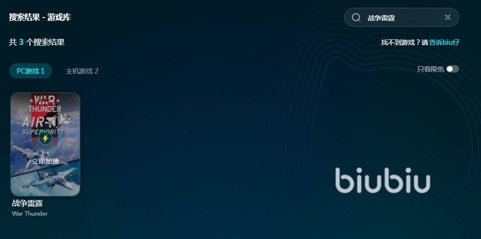 現(xiàn)在biubiu正好有免費試用的活動,只要注冊了新用戶就能享受24小時免費加速,新用戶首充折扣也很低,只要15元起就能充值會員了。小編還給大家申請到了額外3天免費加速的福利,所有用戶到軟件當中輸入【biubiu不卡頓】兌換碼就能領(lǐng)取。免費的加速時長搞定了,接下來只要搜索戰(zhàn)爭雷霆找到加速資源就能暢玩起來了。