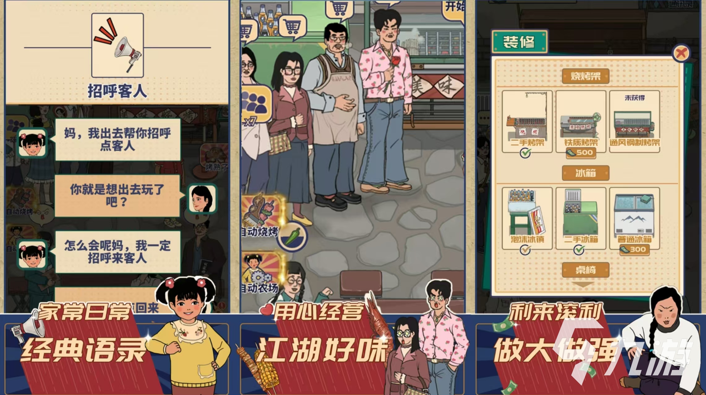 《時光燒烤攤》游戲里面的場景發(fā)生在80年代,擁有著很多復古的建筑,角色的妝容穿著也都符合當時年代,每一位顧客擁有著不同的口味和需求,當顧客選擇好食材之后玩家需要進行烹飪。需要注意每一款食物需要不同的火候和烹飪時間,當顧客滿意之后會被玩家?guī)斫饚攀找?。在賺取足夠的金幣時也需要升級食材和設備,讓自己的店面進行,擴大來獲得更好的經(jīng)營壯闊。