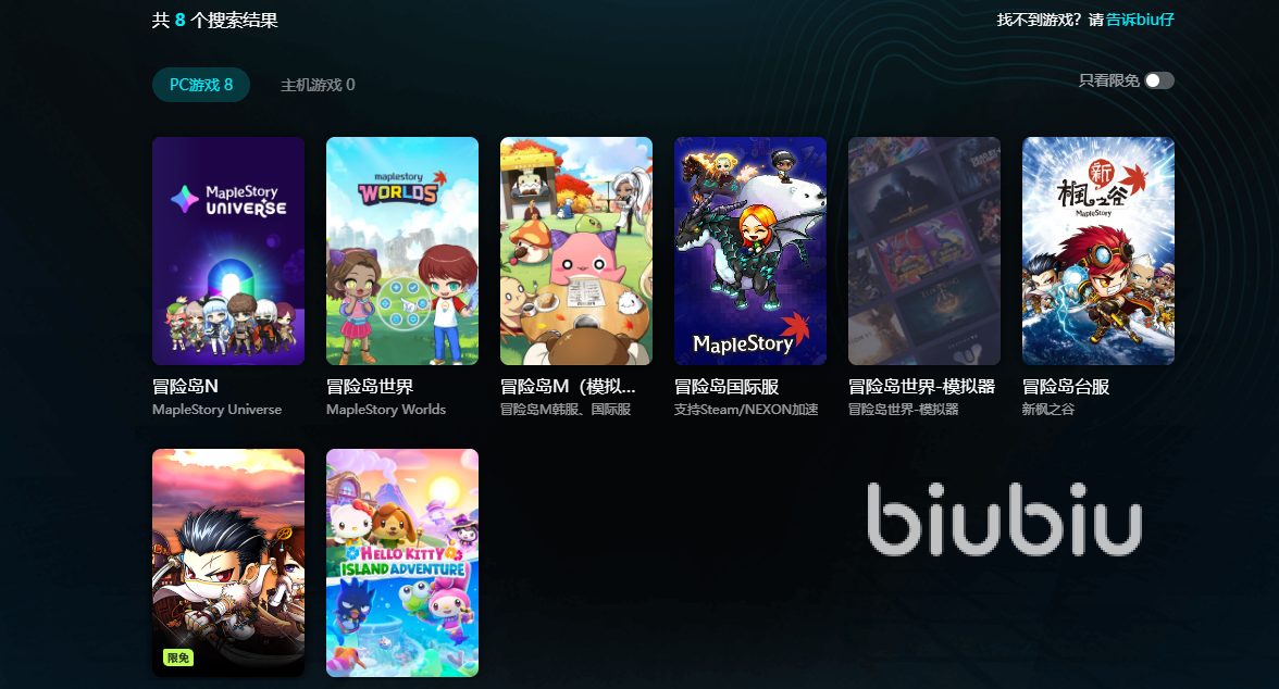 接下來就是第三步了,光安裝之后,并不能馬上讓游戲獲得加速效果,最后就是在biubiu平臺找到冒險(xiǎn)島游戲,并且點(diǎn)擊加速,這樣就賦予了游戲加速效果,當(dāng)然想要游戲獲得效果,最終還是需要通過biubiu啟動游戲即可。