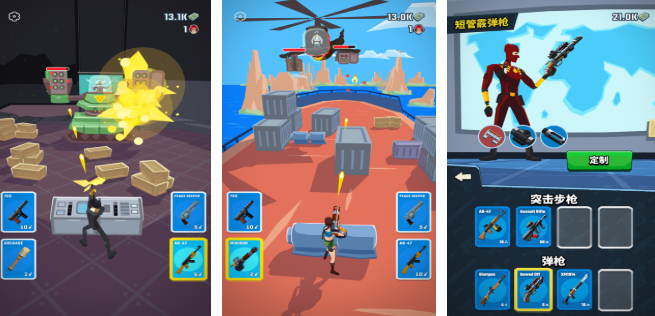 子彈特工最有意思的就是能利用子彈反彈攻擊敵人,比如敵人躲在箱子后面,直接開(kāi)槍打不到,這時(shí)候就得找好角度,讓子彈碰到墻壁反彈過(guò)去正好擊中敵人,戰(zhàn)斗的時(shí)候場(chǎng)景里會(huì)有很多可利用的東西,除了單人闖關(guān)還能玩生存模式,一波波敵人不斷涌過(guò)來(lái),得一邊躲子彈一邊反擊,撐得時(shí)間越長(zhǎng)給的獎(jiǎng)勵(lì)越多。