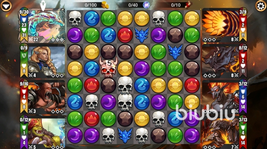 要知道該游戲中所準(zhǔn)備的玩法方面還是很豐富的,并且?guī)砹硕喾N不同顏色的寶石以及骷髏,玩家到時(shí)候則是要依次去進(jìn)行消除,以此來獲取對(duì)應(yīng)的寶石能量,同時(shí)在消除四個(gè)以上同色的時(shí)候,就能額外獲得一回合,消除三個(gè)則是直接進(jìn)行攻擊,可以說在玩法方面還是很有趣的,同時(shí)也富有休閑趣味在其中。