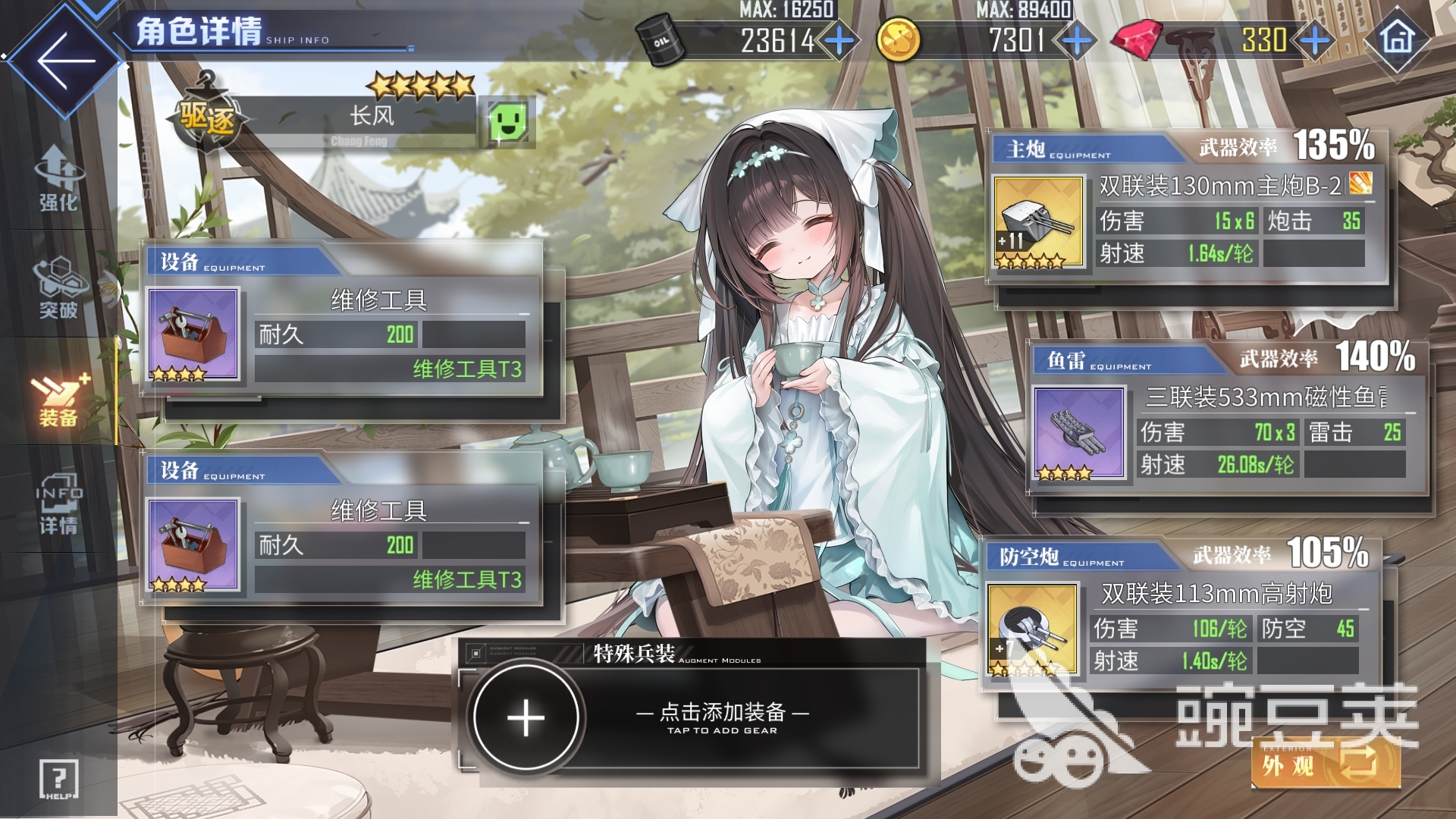 配裝方面,長風(fēng)在戰(zhàn)斗中采用泛用配裝即可,頂配可用彩秋月炮增加彈幕傷害,次選B13炮,魚類金四磁即可,若前排沒人能帶金四磁改或前排中長風(fēng)的雷擊屬性最高,也可給她用金四磁改增加雷擊輸出。防空炮最好的選擇是彩76,設(shè)備帶雙飯盒就行,需提高反潛能力的作戰(zhàn)環(huán)境可用一飯盒一刺猬彈的配裝。低配配裝則更為簡單,主炮用紫127改或紫雙聯(lián)120,魚類用紫三磁,防空炮能上金雙聯(lián)113最好,沒有也可用紫雙聯(lián)113過渡,設(shè)備搭配方案與頂配一致。