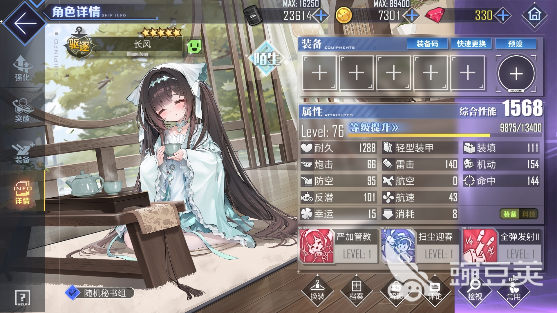 長風(fēng)可通過技能嚴(yán)加管教來令自身的雷擊屬性得到提高,而且在隊伍里有其它東煌角色存在時,長風(fēng)還能獲得陣營buff,在技能滿級時可為自己提供10%的增傷。此外,戰(zhàn)斗中每過20s,長風(fēng)都會發(fā)射一輪彈幕并為其它長風(fēng)級艦船提供可抵擋6次子彈的護(hù)盾,但獲得護(hù)盾的艦船速度會降低。另外,長風(fēng)的二技能掃塵迎春能為隊中的東煌陣營艦船提供減傷和減少她們被點(diǎn)燃的時間,要是進(jìn)入戰(zhàn)斗后,若同隊東煌艦船處于點(diǎn)燃狀態(tài),長風(fēng)還能直接消除該狀態(tài),并提高她們的幸運(yùn)值,該效果內(nèi)置CD為15s。