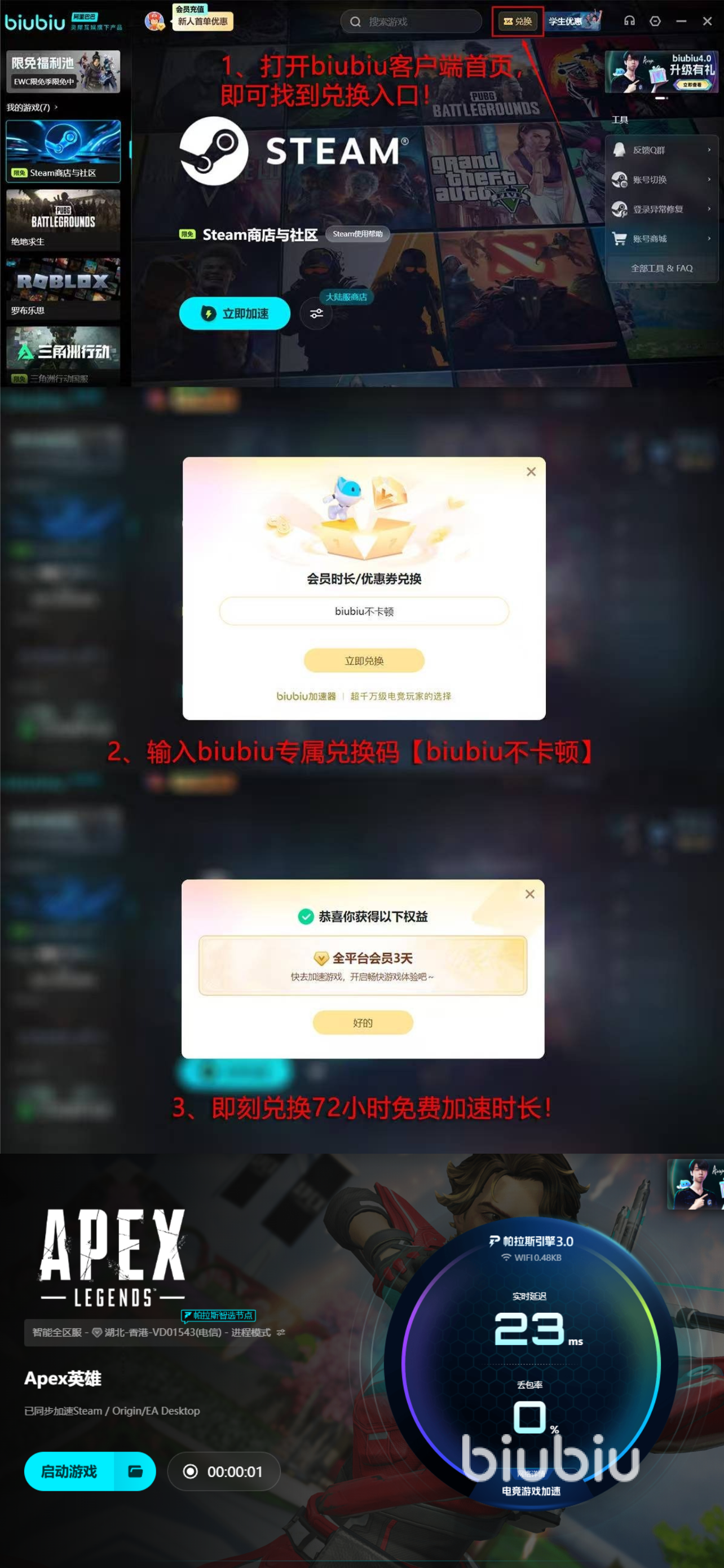 上方小編給大家推薦的這個(gè)加速應(yīng)用有超多福利,比如新用戶登錄有24小時(shí)免費(fèi)提速服務(wù),此外平臺(tái)還給每個(gè)用戶都額外提供三天加速時(shí)長(zhǎng),只需要輸入【biubiu不卡頓】就可以了。而且當(dāng)前平臺(tái)進(jìn)行了全新的重磅升級(jí),和冠軍選手Aixleft一起合力打造了最新的帕拉斯引擎3.0系列。如果小伙伴們后續(xù)覺得不錯(cuò)的話,就可以考慮購(gòu)買平臺(tái)會(huì)員,首次充值可以享受超低折扣,若是學(xué)生用戶還有專屬優(yōu)惠的青春價(jià)格可以享受,一鍵認(rèn)證即可。除此之外,在特定時(shí)期還會(huì)有各種優(yōu)惠活動(dòng)提供,以及相關(guān)的限免池開放,其中不少都是當(dāng)下十分爆火的作品和一直以來(lái)都有很多玩家長(zhǎng)期堅(jiān)持游玩的經(jīng)典。