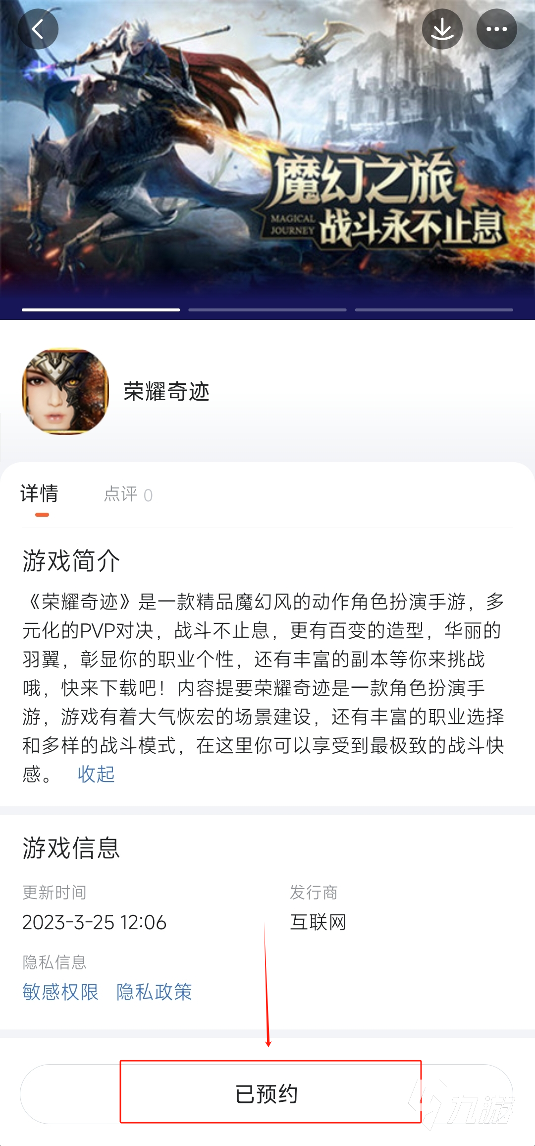 目前榮耀奇跡還沒有上線,想要預約游戲的玩家,大家可以先點擊上方鏈接下載“九游app”。進入九游app后,搜索“榮耀奇跡”游戲,進入對應的游戲?qū)^(qū),點擊頁面下方的【預約】按鈕,就能立即預約游戲了,預約后,榮耀奇跡上線時就會第一時間收到新動態(tài)時提醒。九游app涵蓋了大量國內(nèi)外熱門游戲,除了下載和預約手游,部分游戲還有專屬禮包、預約獎勵、活動福利可以領(lǐng)取。