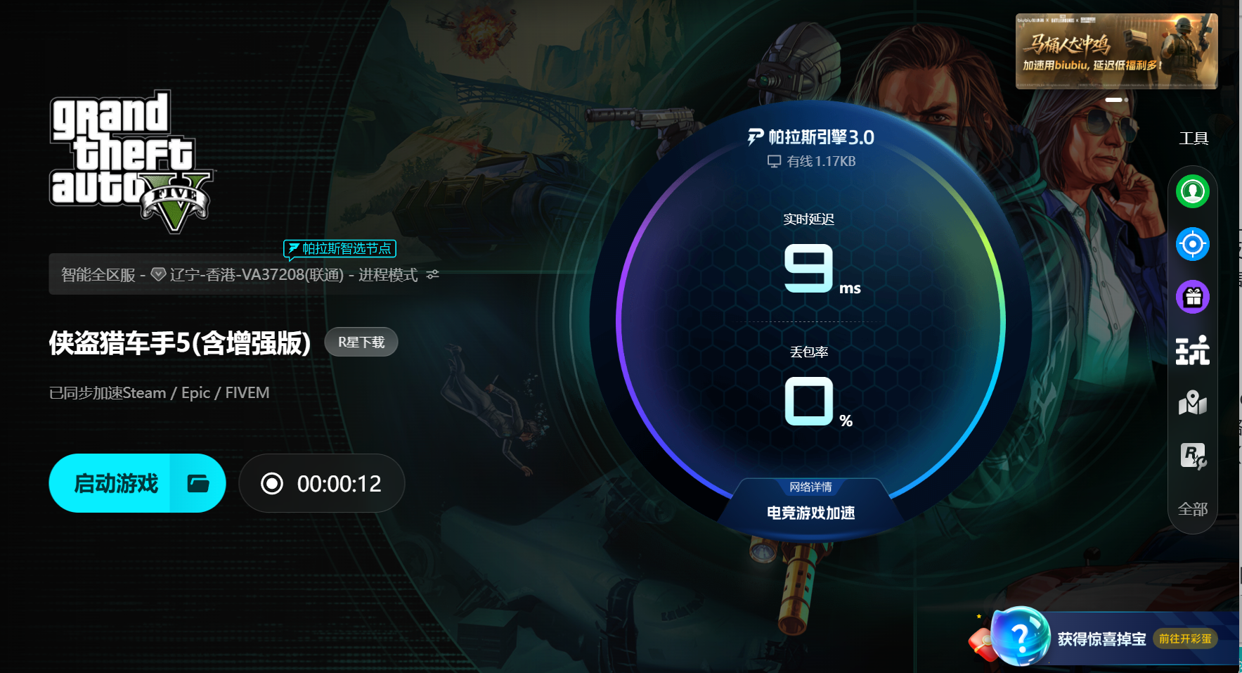 操作過程也非常省事。打開biubiu客戶端,在游戲列表中選擇GTA5專線后點(diǎn)擊開啟,系統(tǒng)會自動完成節(jié)點(diǎn)匹配與線路優(yōu)化。后臺運(yùn)行輕盈不會影響幀率,也不會拖慢CPU性能。加速成功后重新打開游戲,加載界面迅速跳轉(zhuǎn),不再停留在R星標(biāo)志或線上認(rèn)證界面。整個過程幾乎無感,卻能立刻看出效果,讓玩家能穩(wěn)定進(jìn)入游戲世界。