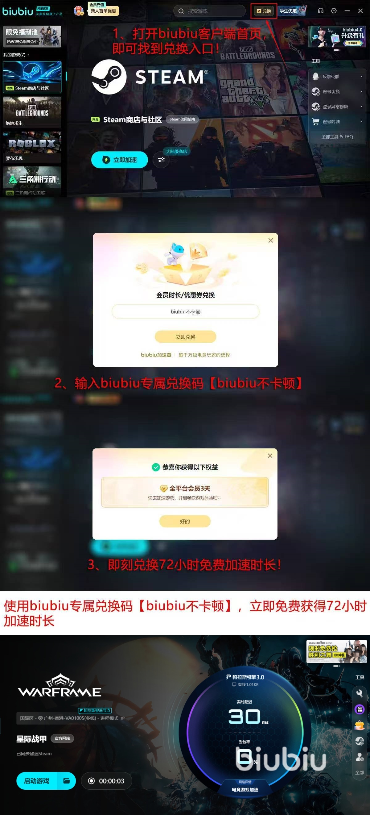 當(dāng)然了,如果玩家希望能去順利領(lǐng)取到更多加速福利,到時(shí)還可主動(dòng)點(diǎn)擊界面內(nèi)出現(xiàn)的兌換按鈕,然后在通過(guò)【biubiu不卡頓】,這樣所有平臺(tái)小伙伴均可順利領(lǐng)取到72H的加速機(jī)會(huì)哦。
