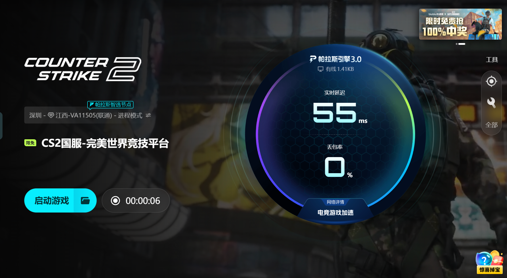 開啟加速后的變化立刻能體會(huì)到。原本開鏡就卡、爆破時(shí)幀數(shù)驟降的情況消失,整個(gè)畫面順滑得像新裝的顯卡。槍口抖動(dòng)更穩(wěn)定,換彈、轉(zhuǎn)角、跳投都能即時(shí)反饋。語音同步清晰,隊(duì)友喊的位置和實(shí)際視野完全對(duì)得上。即使在高延遲的外服環(huán)境中,操作也保持連貫。投擲物的軌跡、子彈的命中判定都回到真實(shí)時(shí)間。節(jié)奏重新穩(wěn)定下來,比賽終于變成了純粹的實(shí)力較量。