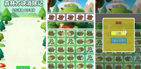 在美麗的森林中,你需仔細(xì)觀察完成消除任務(wù),關(guān)卡開(kāi)始后會(huì)看到很多不同的木樁以及斧頭等等,有剛長(zhǎng)出嫩芽的樹(shù)木,或者有圓滾滾的樹(shù)樁等等,這些物品的位置都是隨機(jī)打亂的,而你通過(guò)拖拽的方式,將相同物品放在最上方的空白格中,即可快速消除。每次消除時(shí),可能會(huì)觸發(fā)連鎖消除,一次性累計(jì)更多分?jǐn)?shù)。